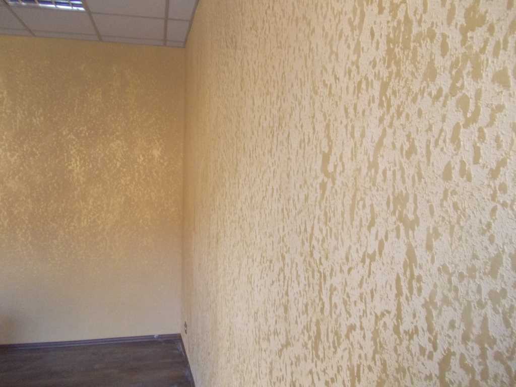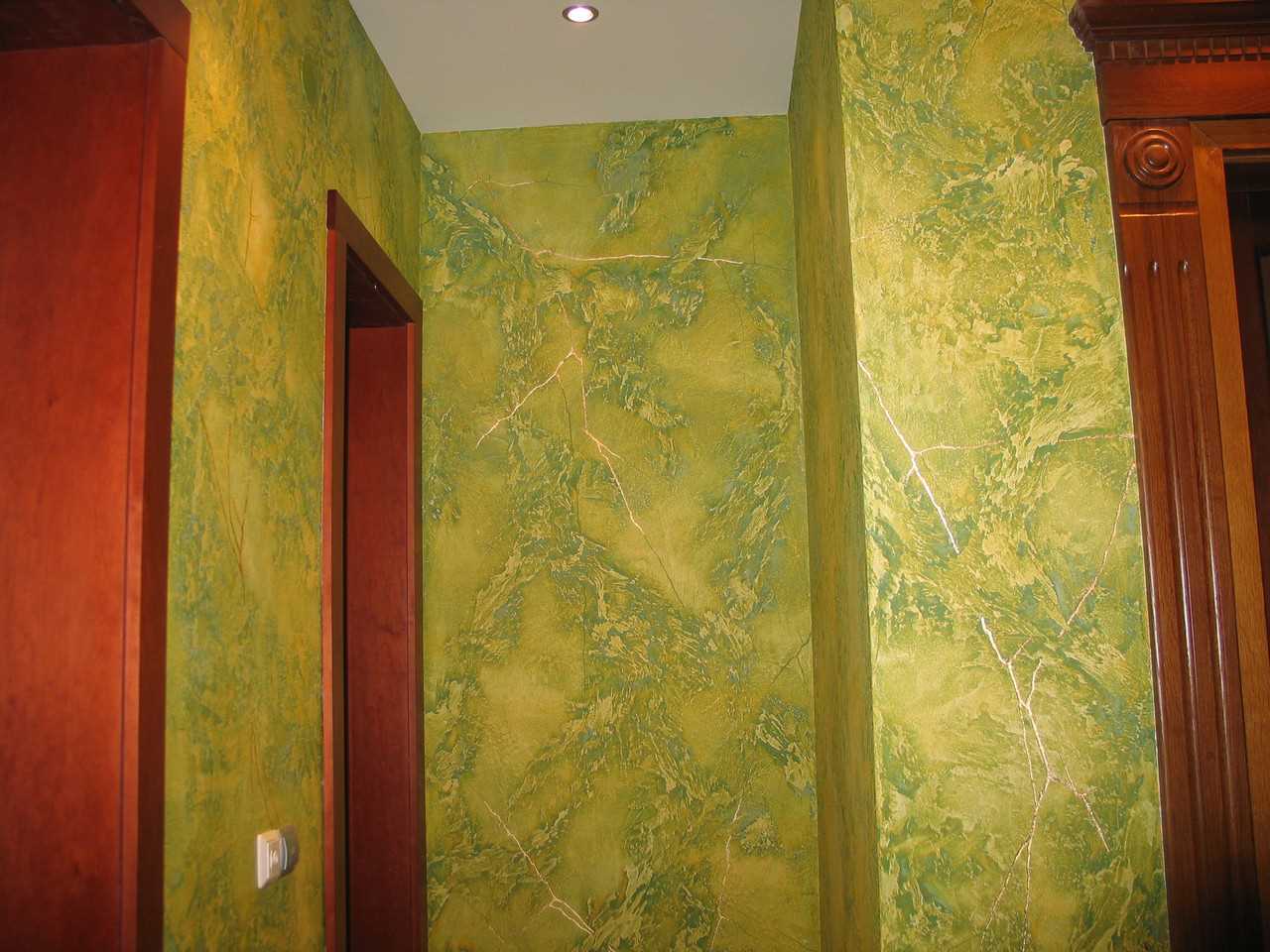 Tout d'abord, l'apprêt est dilué avec de l'eau dans un rapport de 2: 1, puis le composant sec est introduit, tout cela est mélangé avec un mélangeur de construction jusqu'à l'obtention d'une pâte crémeuse. Ils travaillent sur une surface de départ préparée, créant des motifs "liquides". Ils ont rapidement pris, laissant une texture spectaculaire qui peut être encore tachée avec un rouleau moelleux ou pulvérisée avec un pistolet.