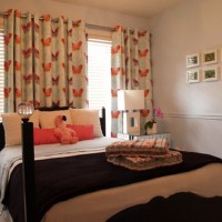 Les rideaux courts conviennent à une petite pièce, surtout si le lit est près de la fenêtre. Une telle décision donnera une atmosphère de facilité et de légèreté.