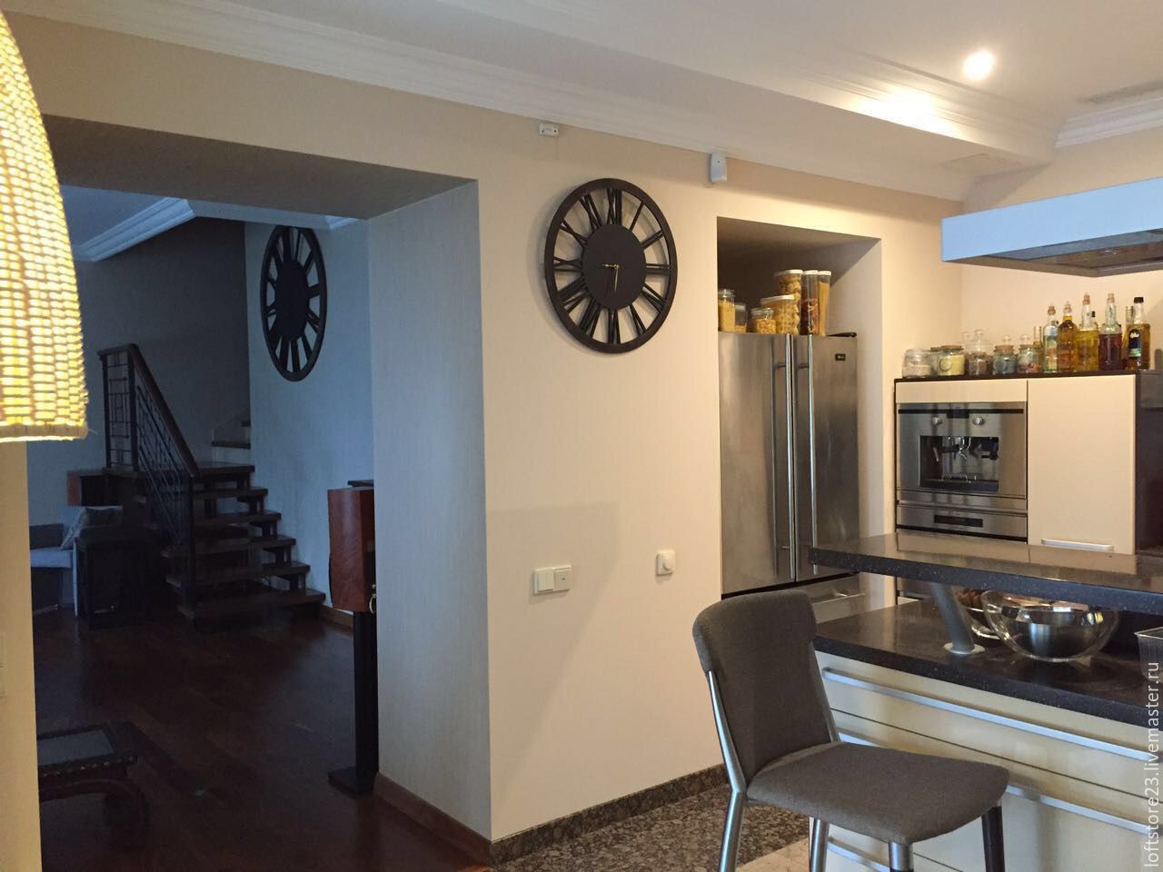 Watches are appropriate in any interior, however large models are preferable to hang on the wall in spacious rooms. If the living room or bedroom does not differ in size, do not risk it. Too massive decor elements visually make the room smaller.