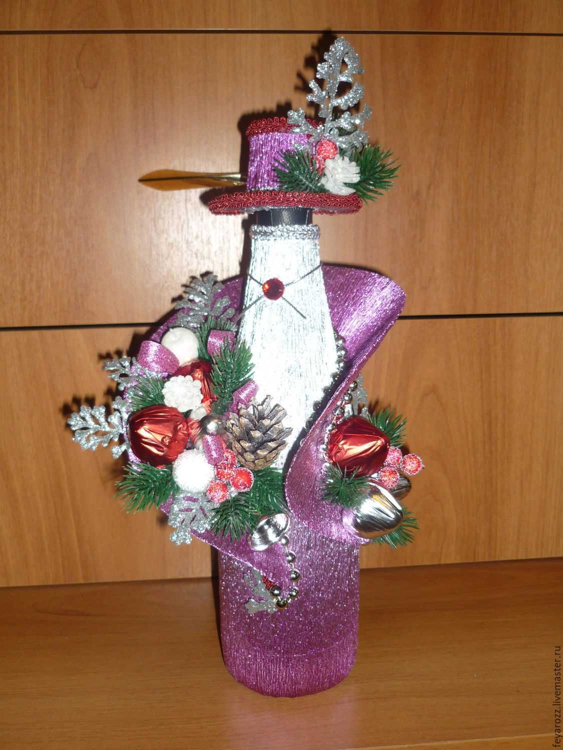 Often, sweets alone seem not enough for a gift, and I want to attach something else to it. In such cases, the master adds soft toys or alcoholic drinks to the composition.