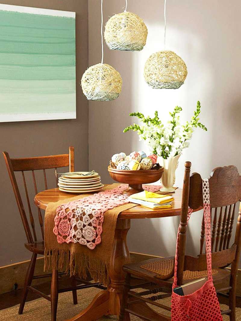 Another easy-to-use decor idea is to create a chandelier from a thick thread or yarn. From the materials for such a handmade you will need: