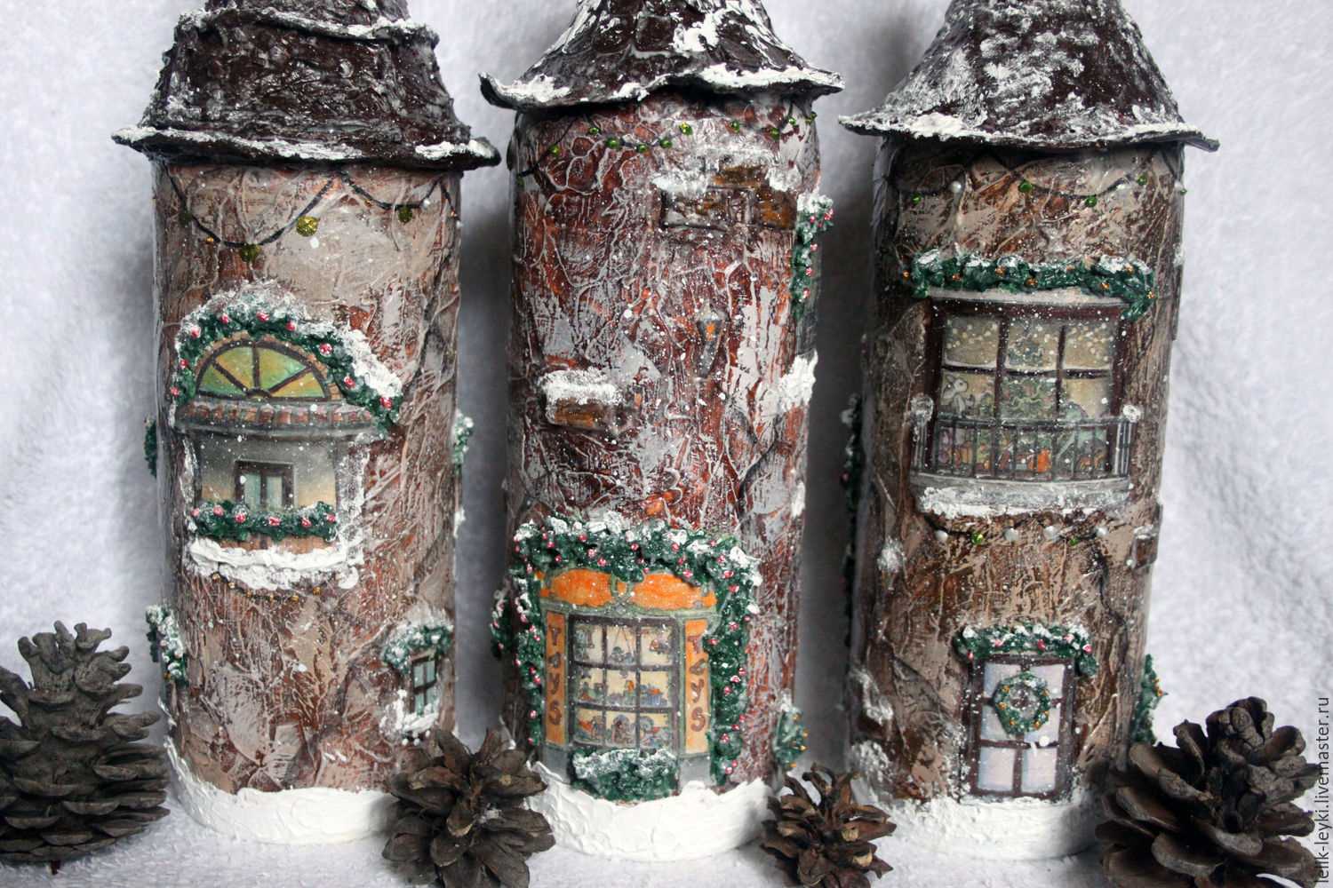 There are other ways to replace Christmas trees when bottle decor is used instead. The composition of chocolates in green foil fixed on a bottle in the form of a Christmas tree looks luxurious. Make sure that treats are not soaked with glue. They can be wrapped up with tape from the bottom up in a circle, hiding the lower rows. It is better to fix the crown of the head with red or golden ribbons with an asterisk or angel, if this is a decor for Christmas. Spraying with white paint - a magnificent winter decor of glass bottles with your own hands.