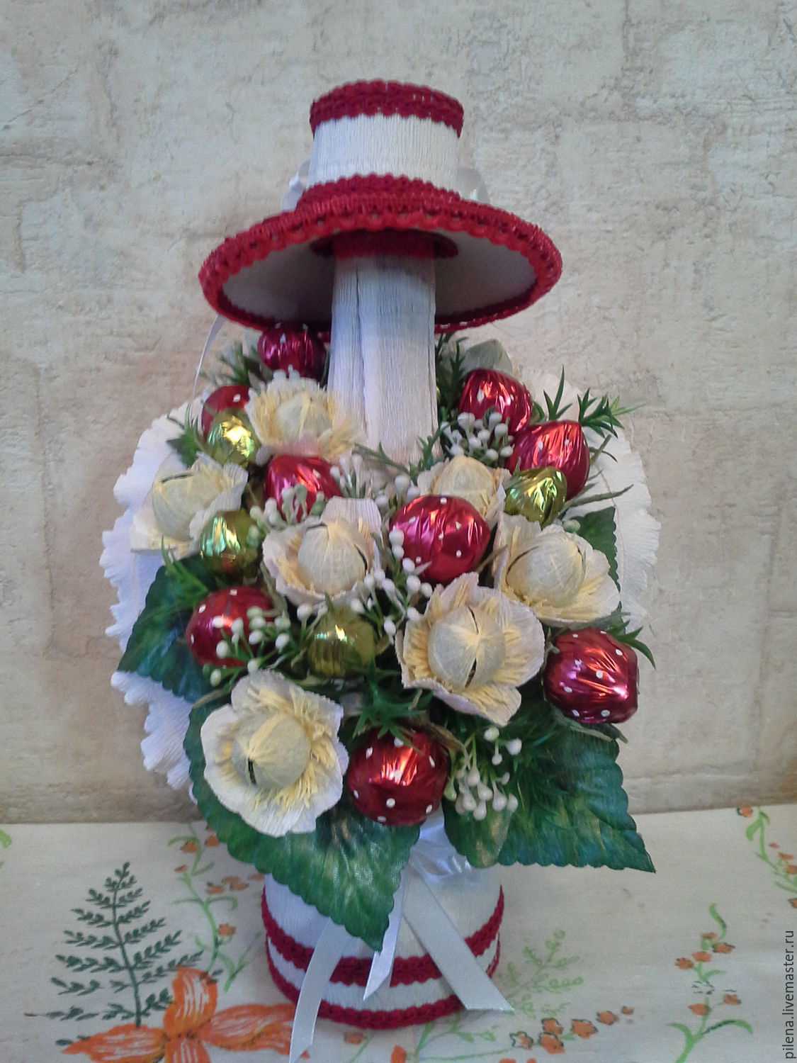 An elegant bottle narrowed to the center in the form of a waist is an idea for making a glass young lady in a hat or under an umbrella. If you add to it a higher container, decorated in the form of a gentleman with a big heart, you get the composition for Valentine's Day.
