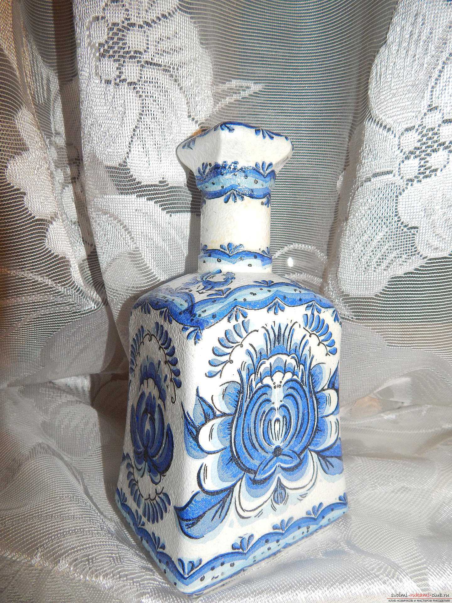 The easiest way is to decorate glass bottles by painting inside or out. For this, transparent containers of different volumes are needed. If they are painted in one color, they will look like a souvenir set. Such items can be combined in 2-3, forming “duets” and “trio”. It is best to use decorated bottles as flowerpots for dry ikebana or artificial flowers.