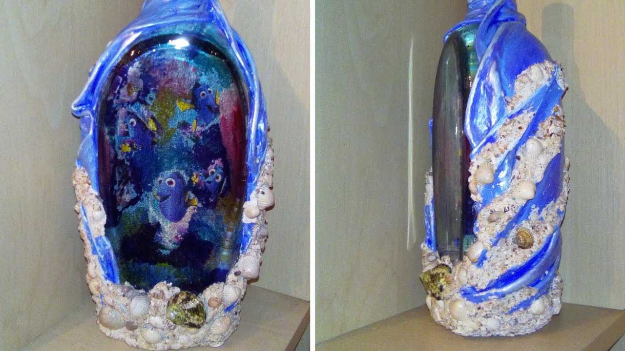 Exterior surface decoration with bulk materials is another simple technique. It’s easy to make designer bottles out of regular beer houses using the transformation of the exterior. An original mosaic base can be easily obtained by gluing pieces of shell onto the glass and coating them with paint. Then you can use any other technique.