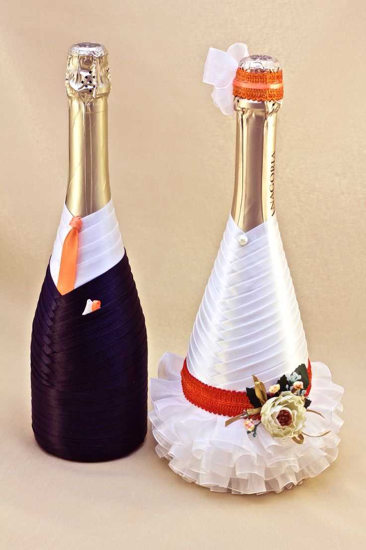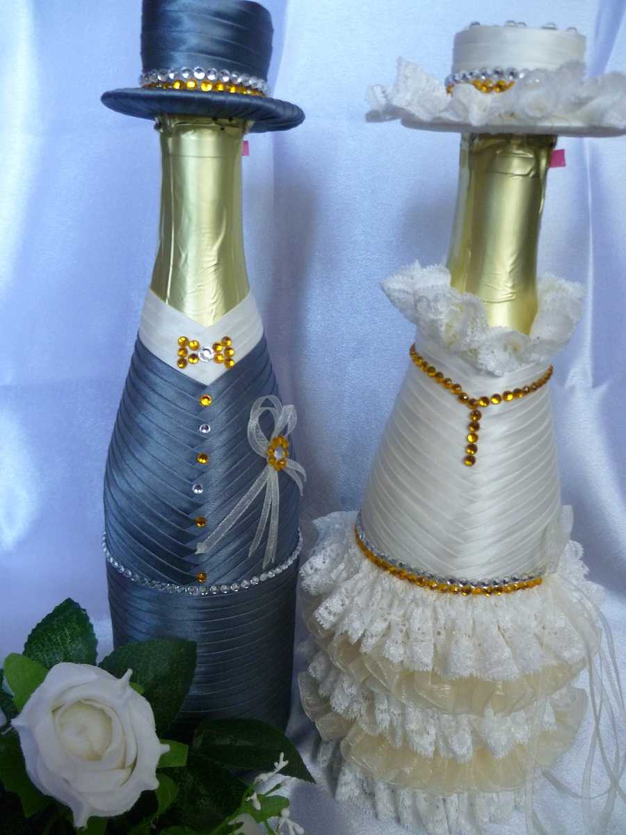 Champagne bottles decorated with satin ribbons like “He” and “She” become an integral attribute of a wedding celebration. Until recently, specialists were engaged in this, and today, anyone who has elementary needlework skills can master the decoration of bottles with ribbons. Such decor is performed in a variety of techniques, from simple braiding with satin and brocade stripes to a delightful performance in the laborious kanzashi technique or to complement decoupage.