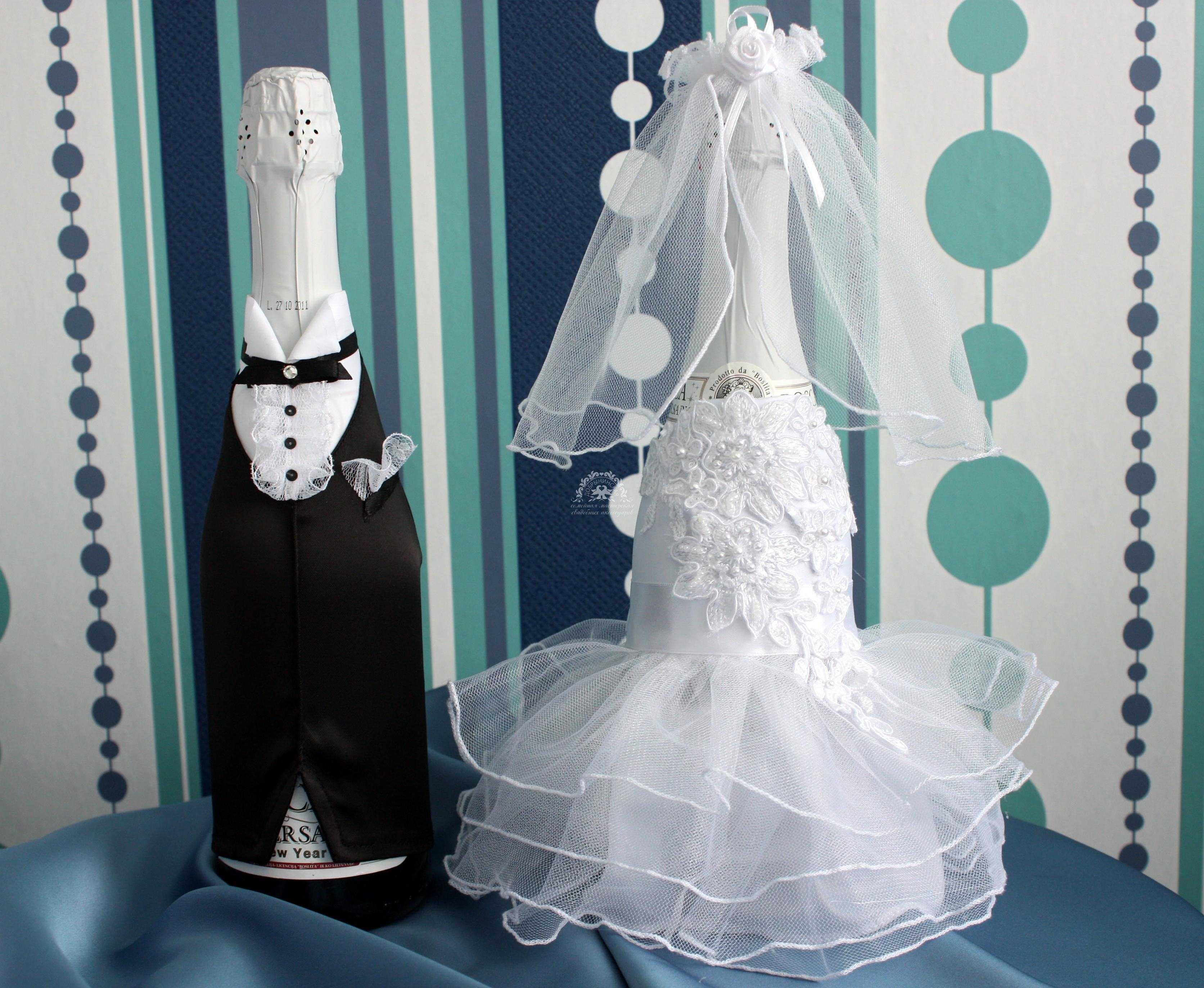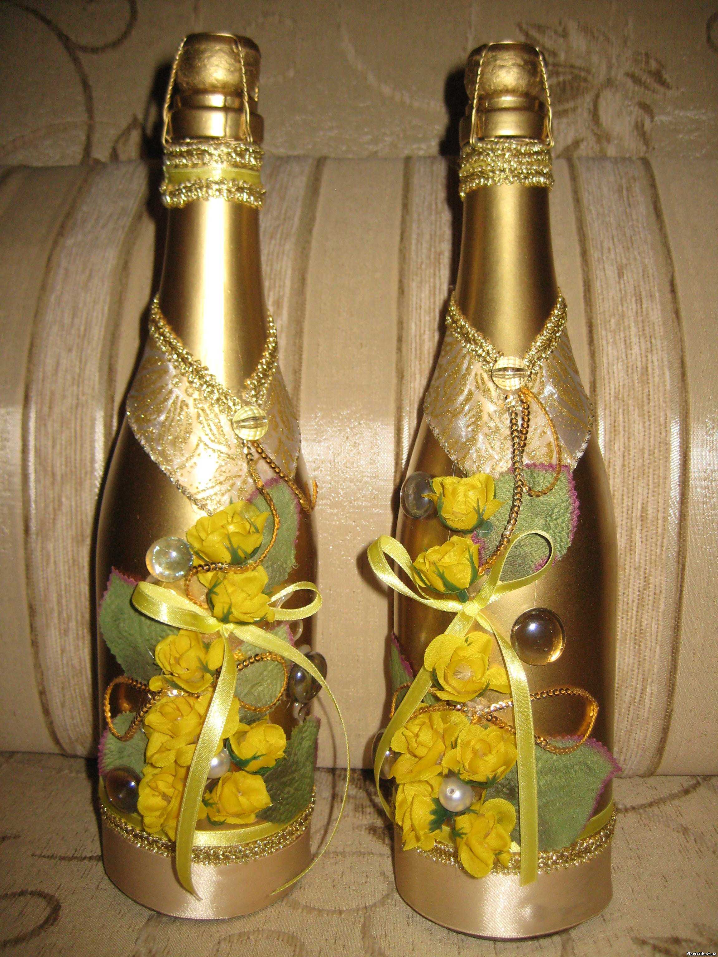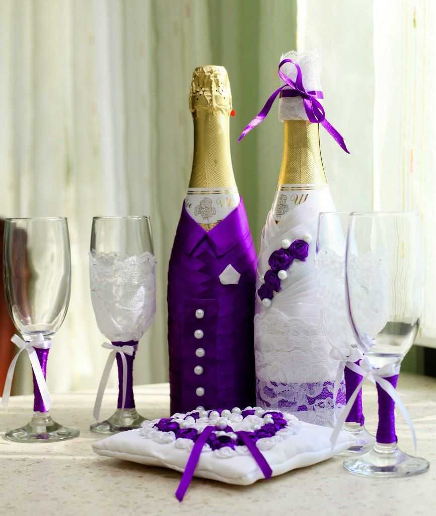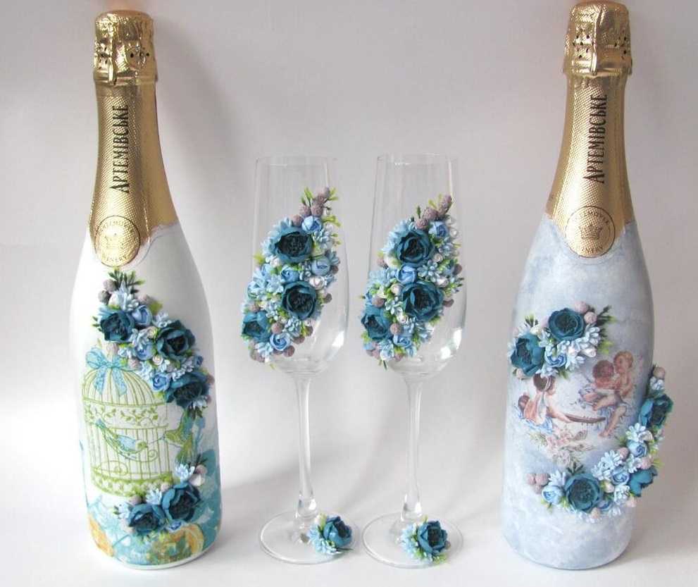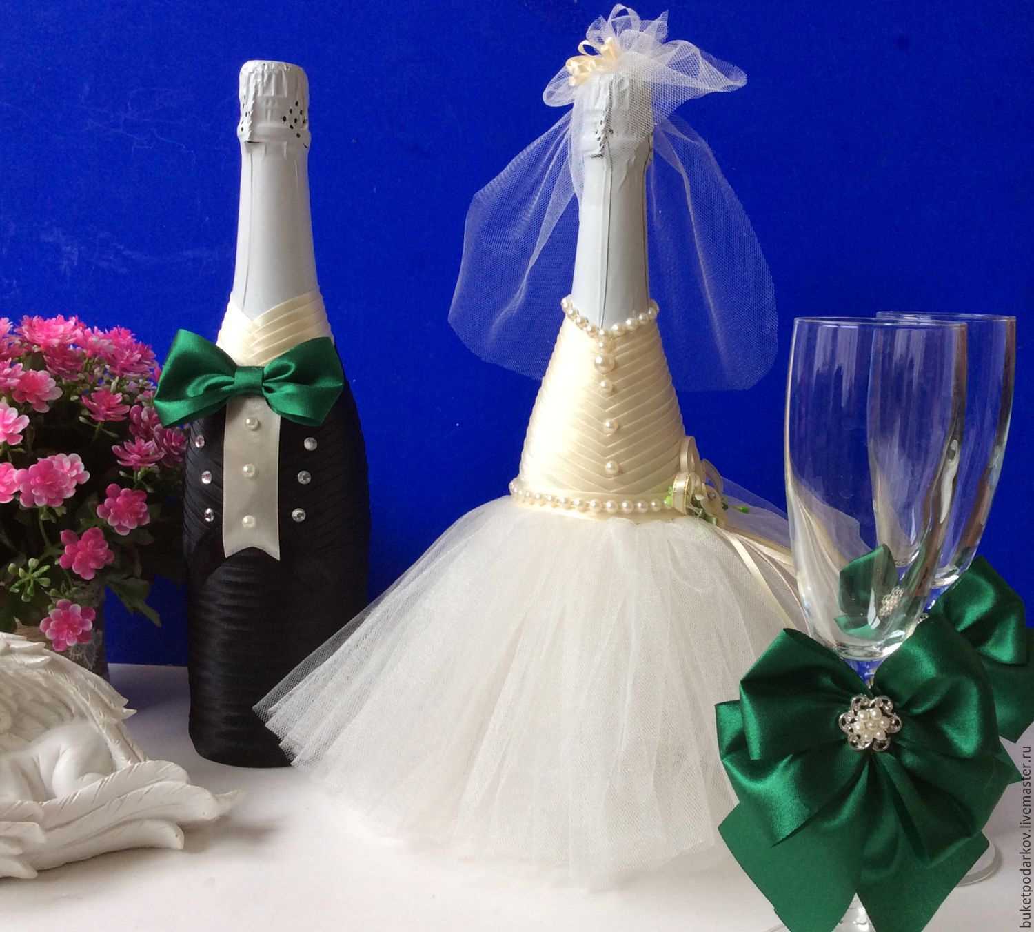 Any idea is good if everything is done neatly and tastefully, the seams are hidden, the decor in moderation. Additionally, it is worthwhile to work on the manufacture of such additions to champagne as rings, angels, flowers, pigeons and hearts. Sometimes they use photos of the bride and groom, printed on thin paper (gloss).