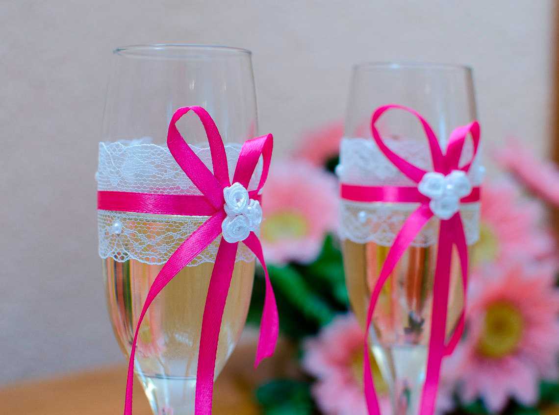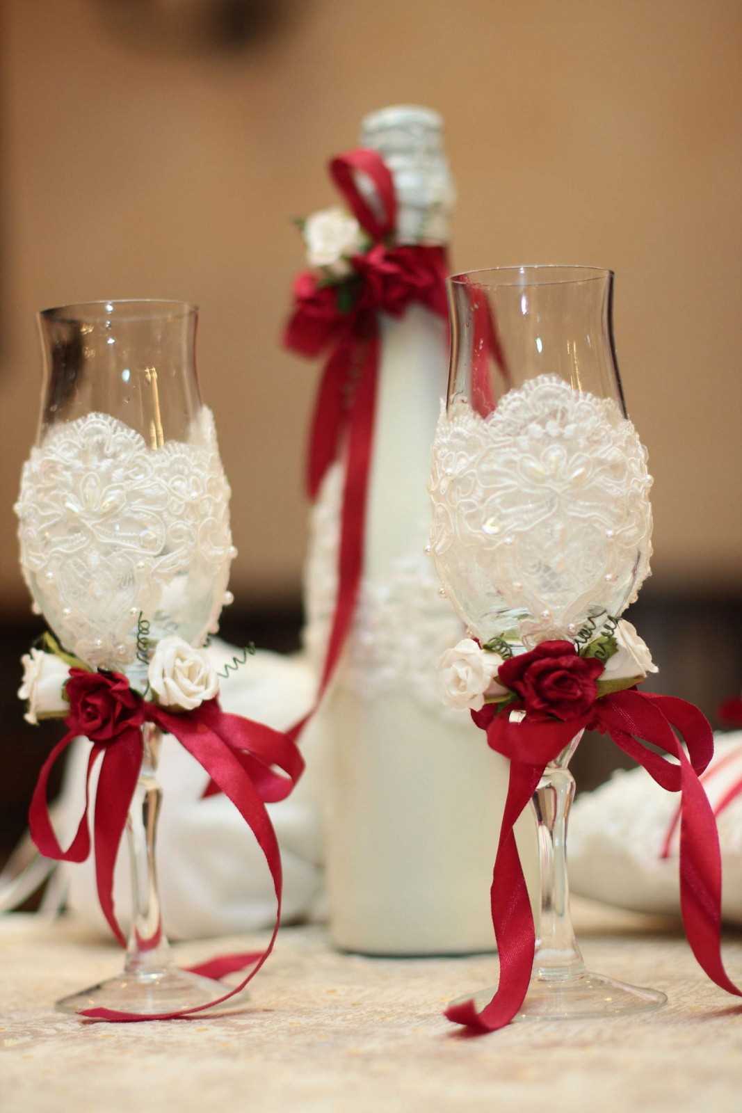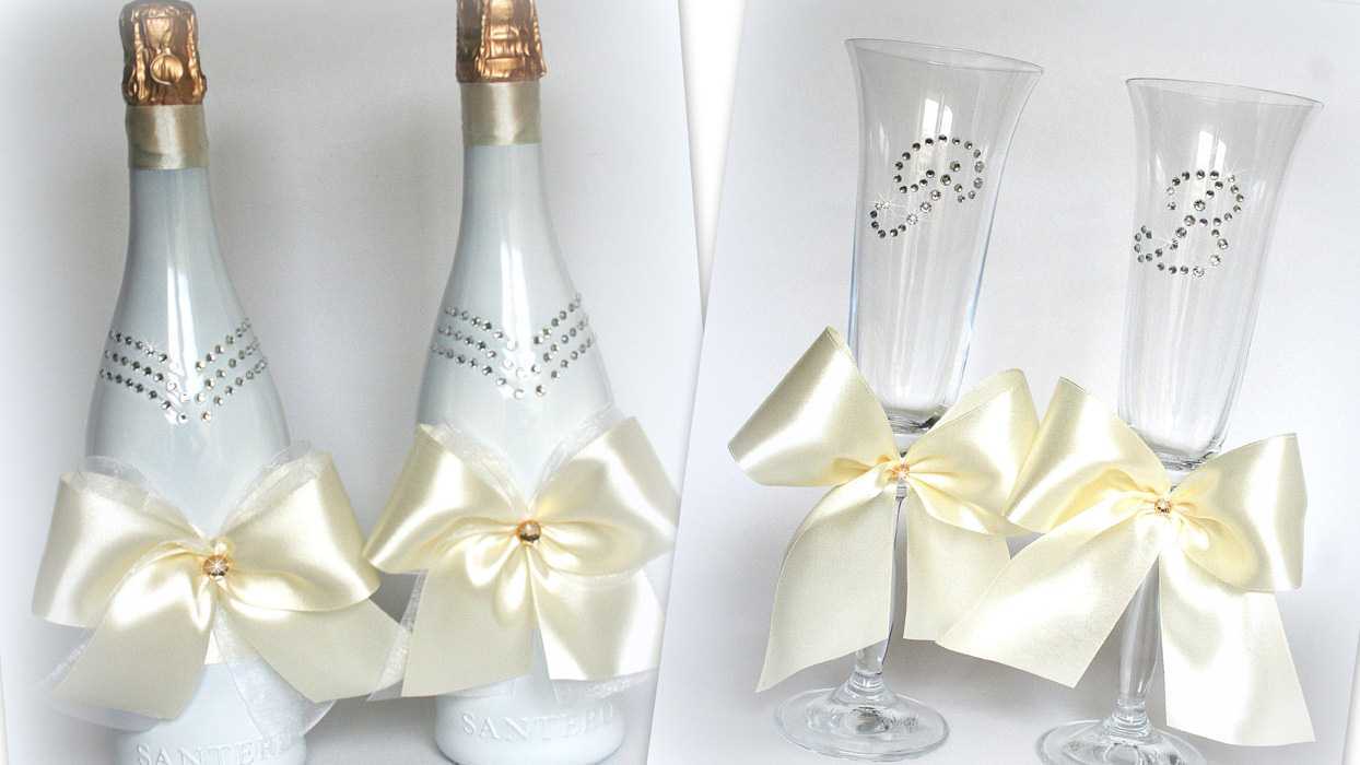Glasses are better to buy separately, and not to take from a set. Most often they are kept for many years as a memory of the wedding, without washing away the design. Next, we decorate the glasses, like the bottles, with satin ribbons with our own hands, so that they form a single set. Decorative elements may vary, but you should tie a bow from the ribbon that wraps champagne on a glass leg. Next, a small decor on transparent glue is attached.