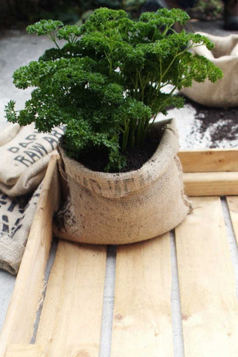 Another option for decorating a flower pot is burlap. Used according to the same principle as another fabric. Such decor will give the garden a gentle rustic look. Complete it with buttons, decorative bugs, pebbles, flowers.