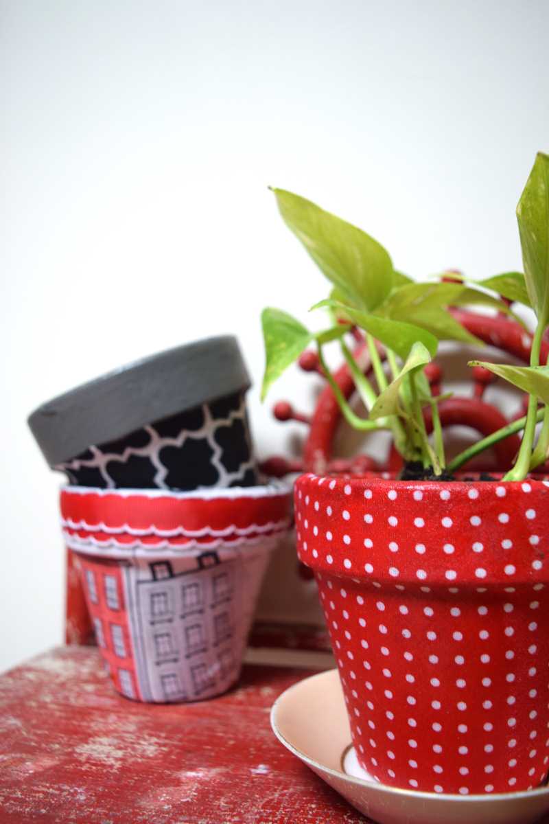 One of the simple and at the same time good options is fabric. To create such a design, you need to take a clean ceramic or plastic pot, wipe it with sandpaper (for better adhesion to the material). Then apply glue to the surface in stripes along the pot in a circle. Now you can start finishing. To do this, carefully attach one edge of the fabric to the pot along its length, and continue to wrap the fabric, smoothing it (so that air bubbles under it do not accumulate). Triangular cuts must be made on both sides to make material easier to fix. Everything! The original pot is ready.