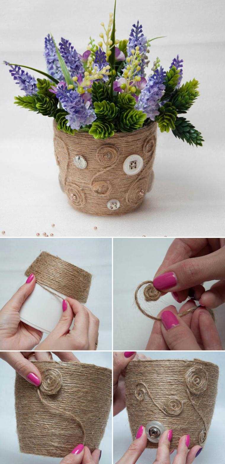 For the decoration of flower pots, the use of ropes and threads in different versions is well suited. Consider a few: