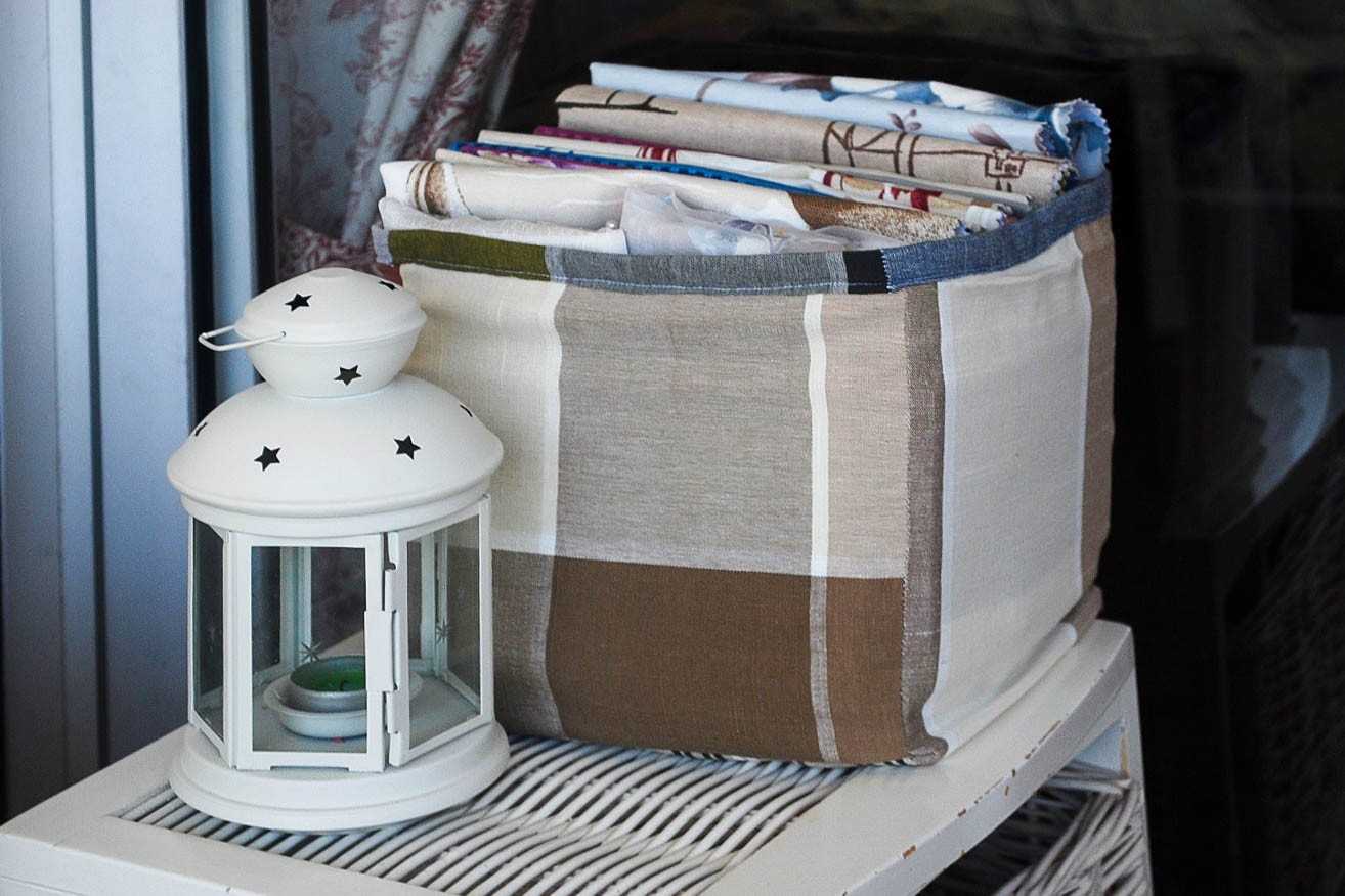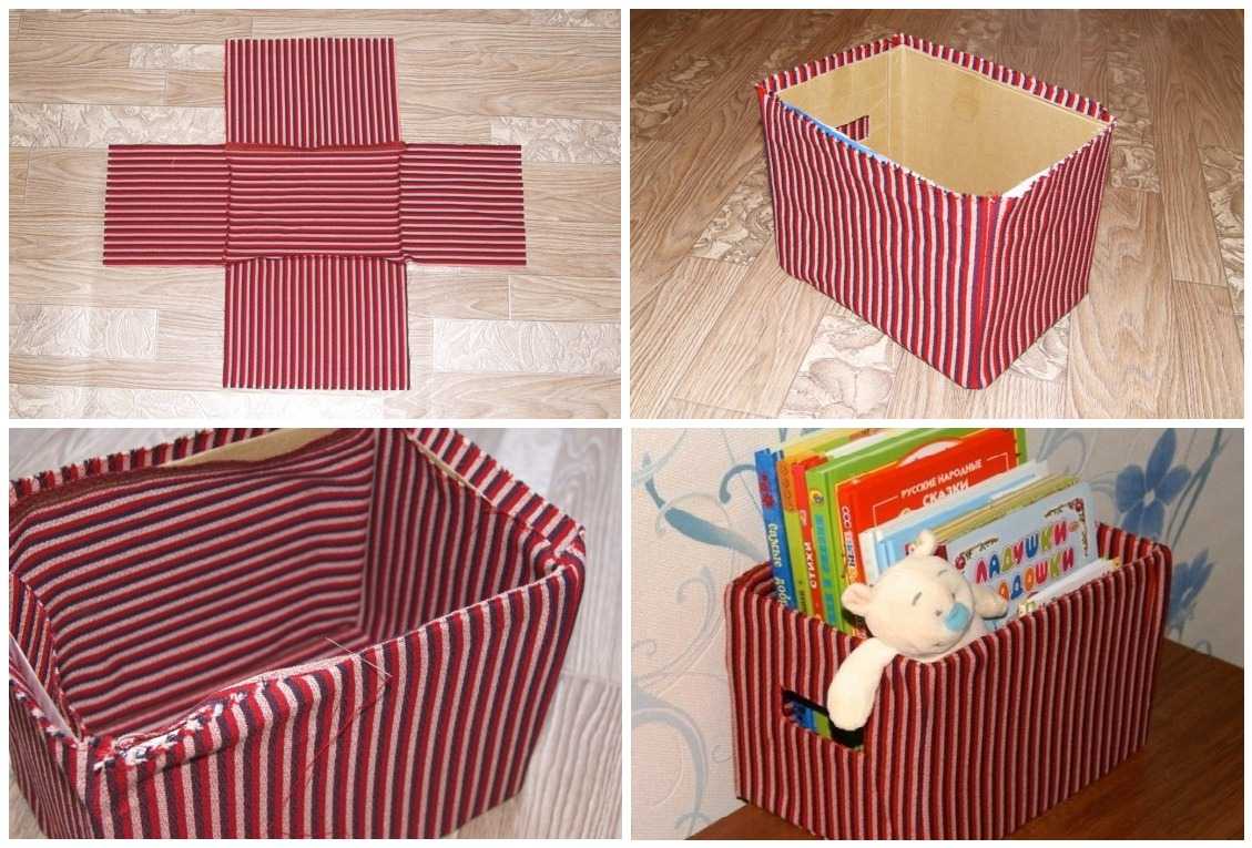 The fabric must be cut in the form of a cross of five rectangles. These rectangles are the sides of a cardboard box. A margin of 1-1.5 cm should be left on each side. Place the box in the middle of the pattern and glue the base with double-sided tape. After - glue on each side one by one, so that the edges of the fabric go slightly overlapping and are wrapped deep. The inner part can also be glued using a light cloth, or sew a bag according to the size of the box. On the edges you can make a double-sided Velcro. So the inner bag can be removed and washed in case of contamination.