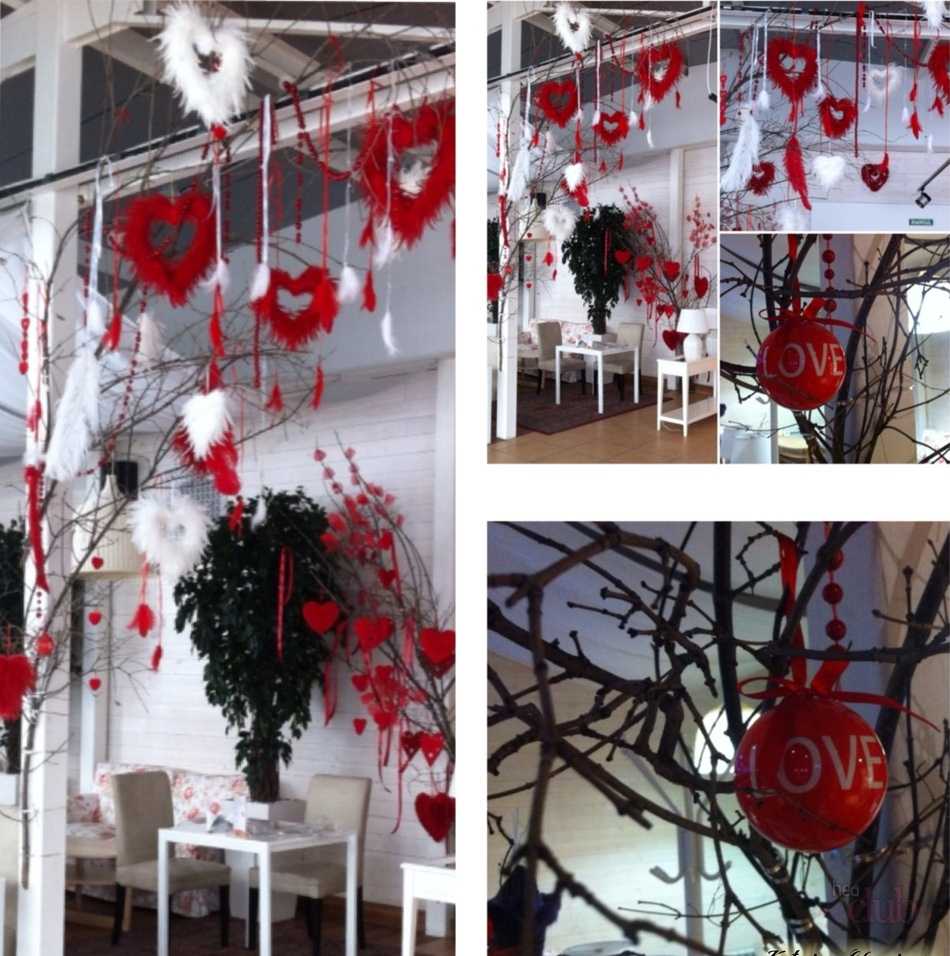 Let's start with the door design. A heart-shaped wreath should be hung on it. Next we enter the room and pay attention to the windows. Garlands of valentines hang on them and on the windowsill there is a "tree of love." We look at the walls: on them are photographs arranged in the shape of a heart held by a boy and a girl (silhouettes are cut out of paper). This option will delight the soul and eye. But this is not the only solution, you can apply an alternative design.