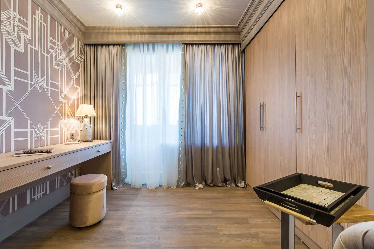 - In the presence of brilliant embossments on wall-paper they are added with opaque curtains in tone.