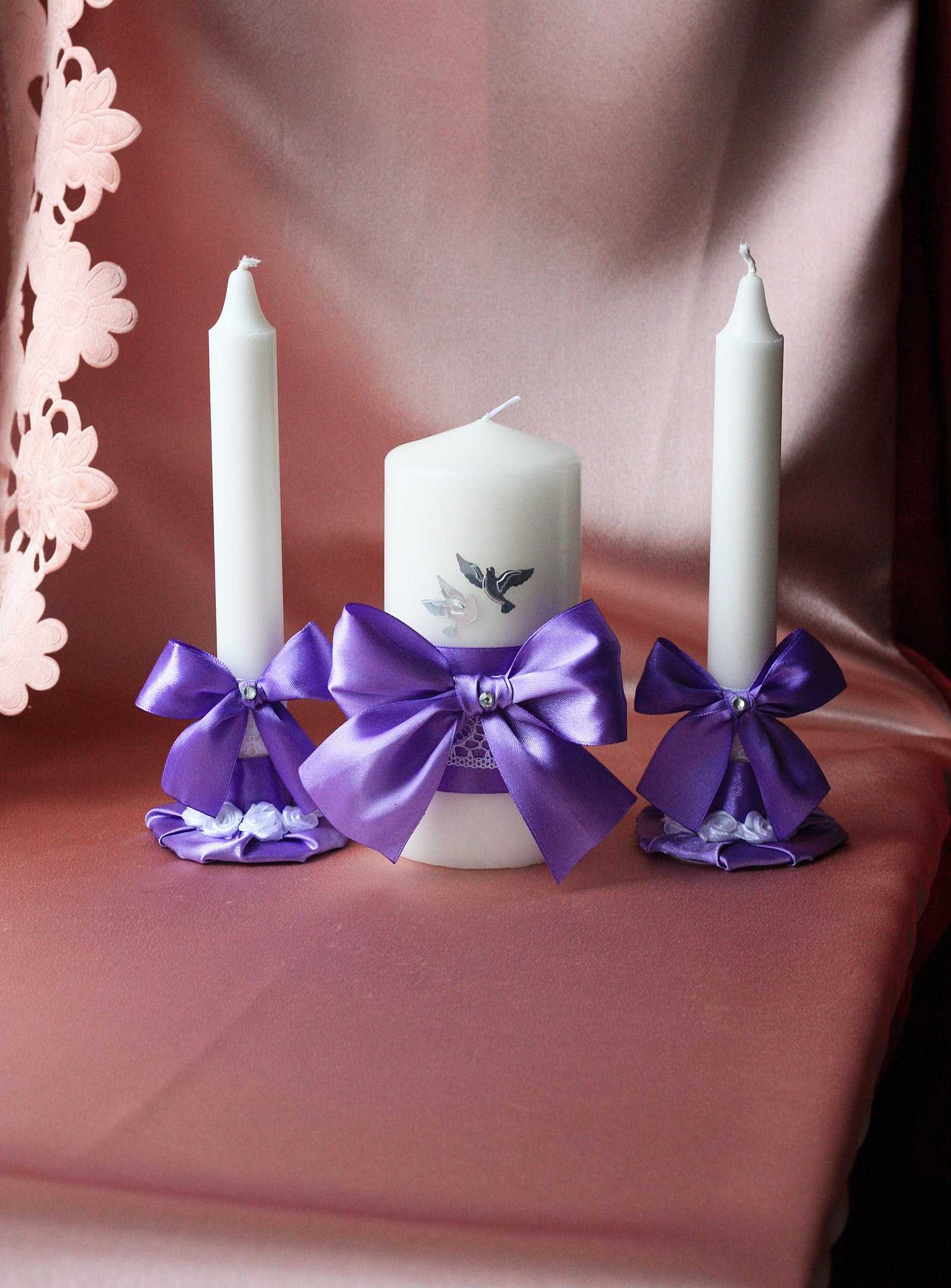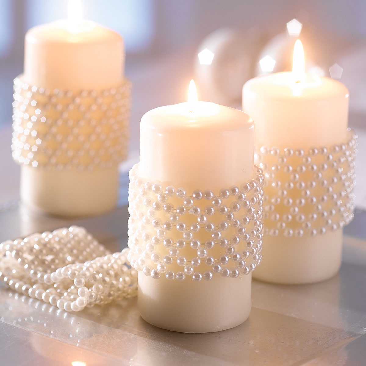 Often several decor elements are used simultaneously. For example, satin ribbons or lace can be additionally decorated with beads, and flower arrangements are combined with ribbons, rhinestones. An easy way to decorate candles is by wrapping them in lace and gluing rhinestones. More complex - floral arrangements, dot painting.