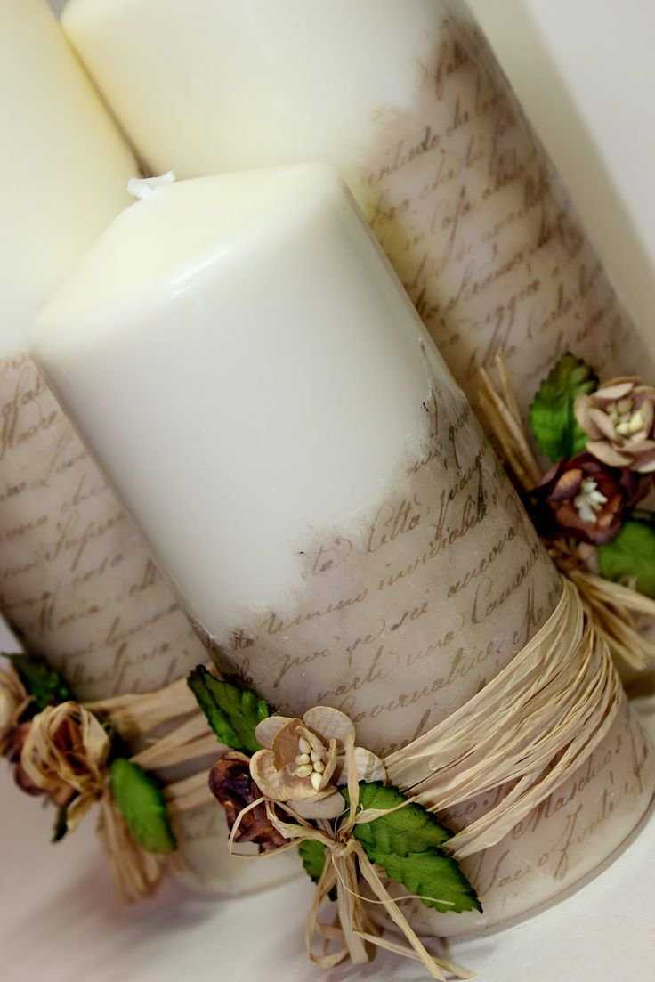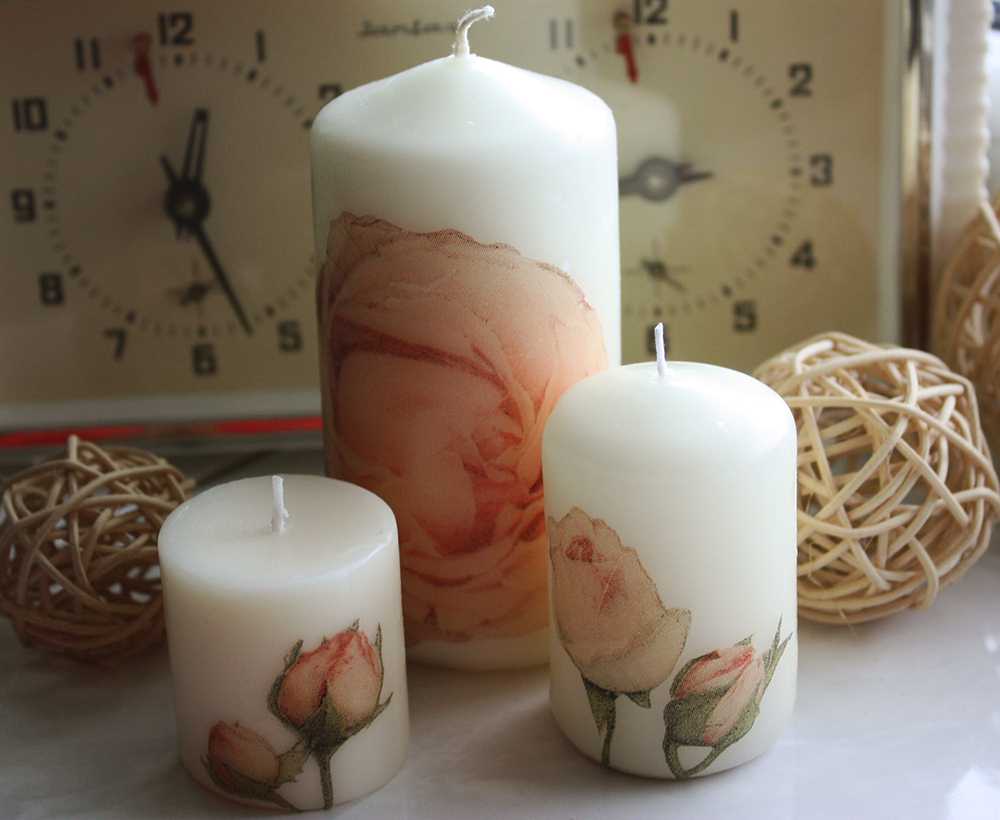 The simplest is the cold way, when a napkin is placed on a candle and simply gently smoothed over the surface, without leaving a single air bubble under the napkin. On top of the candle is varnished.