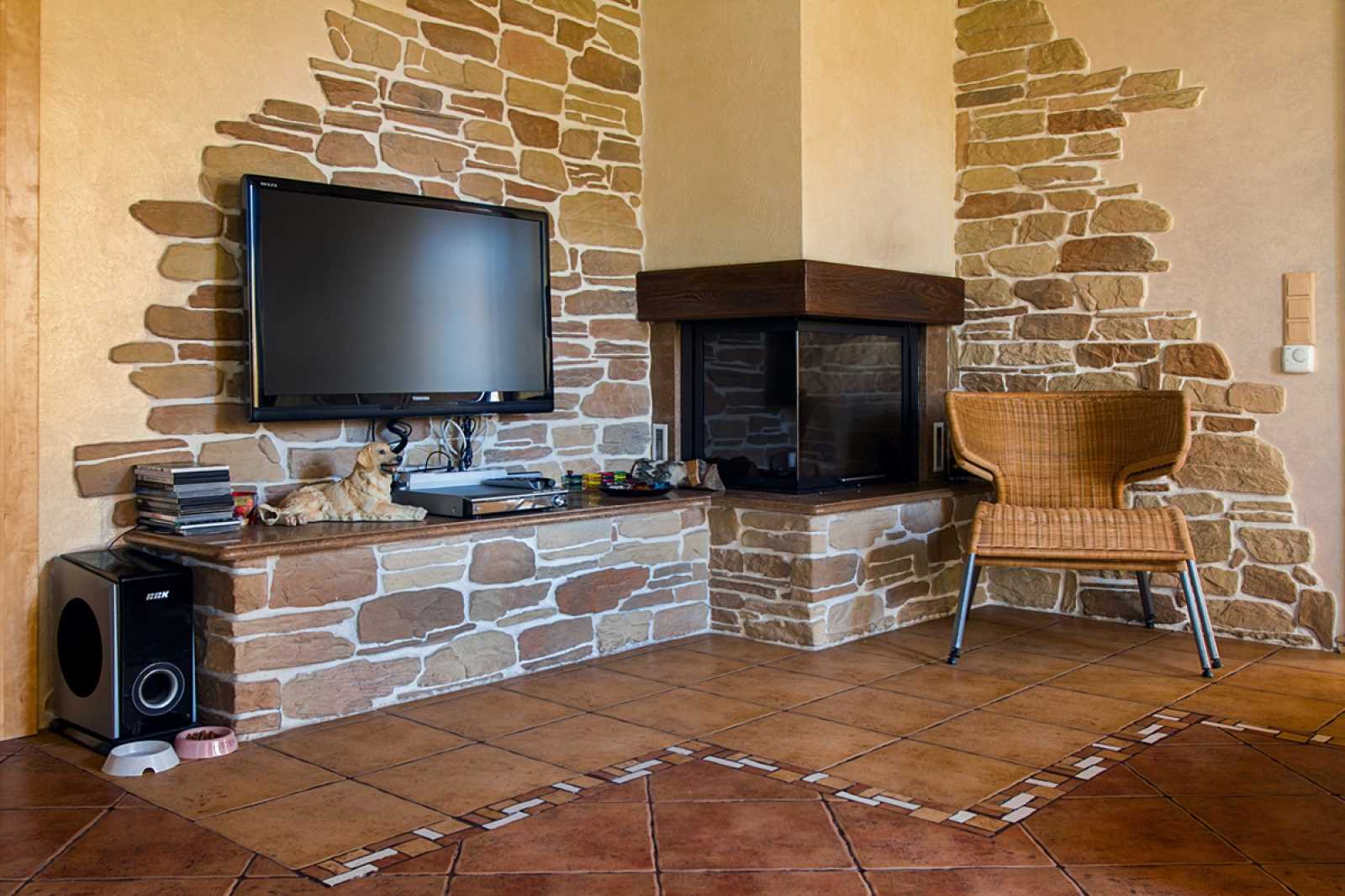 Decoration of the corners of the room can be done with decorative stones.