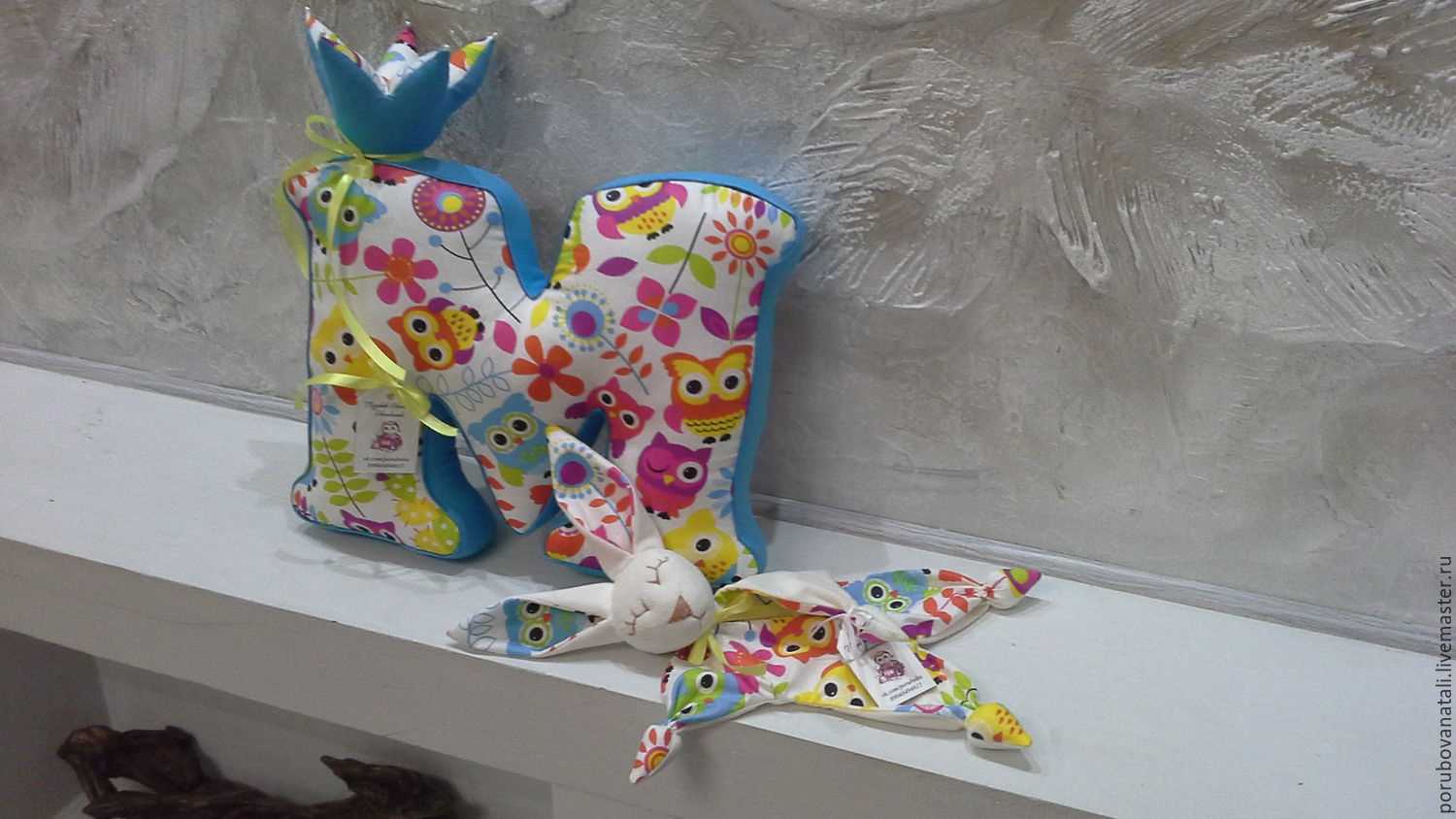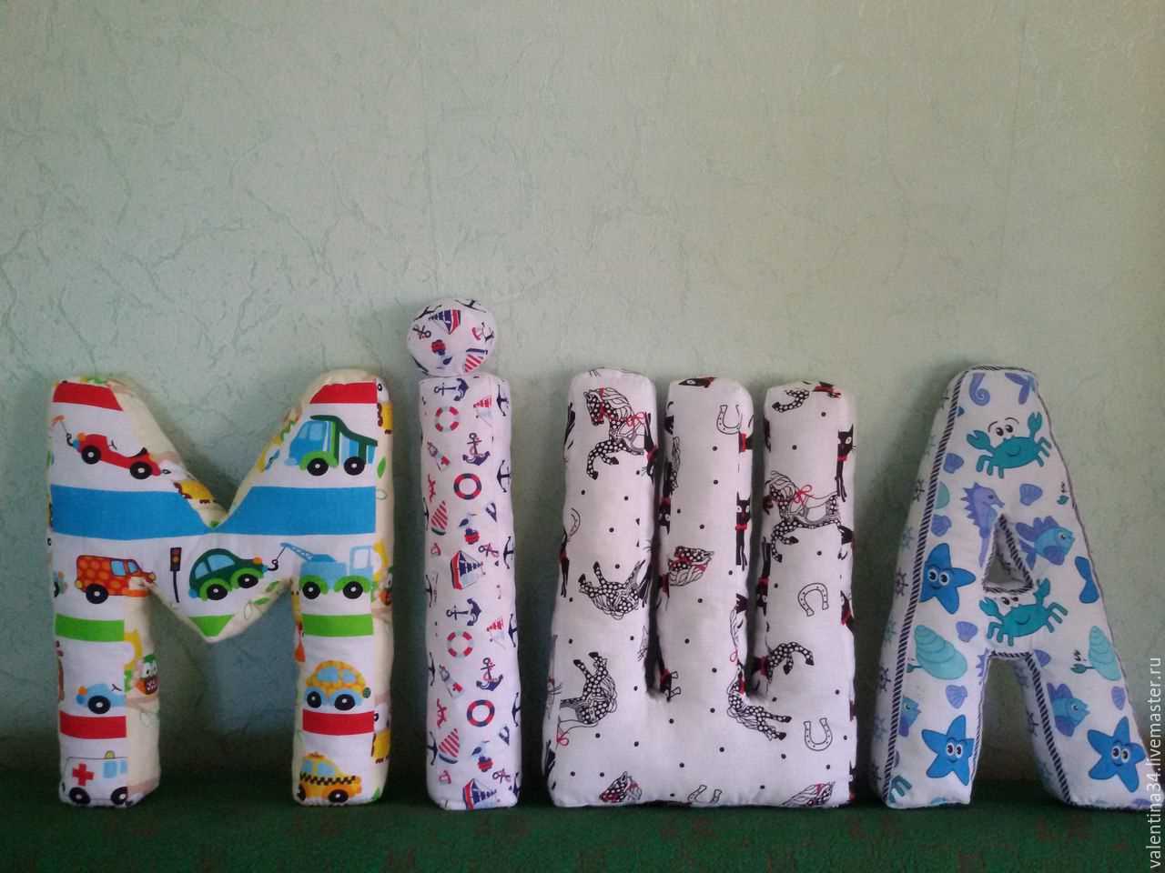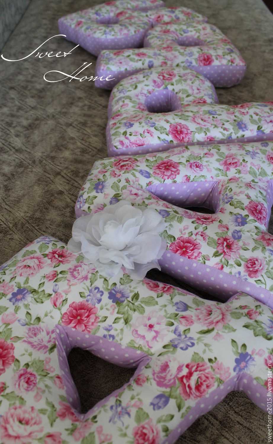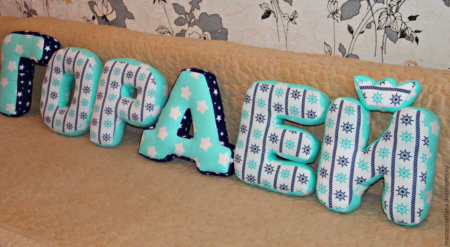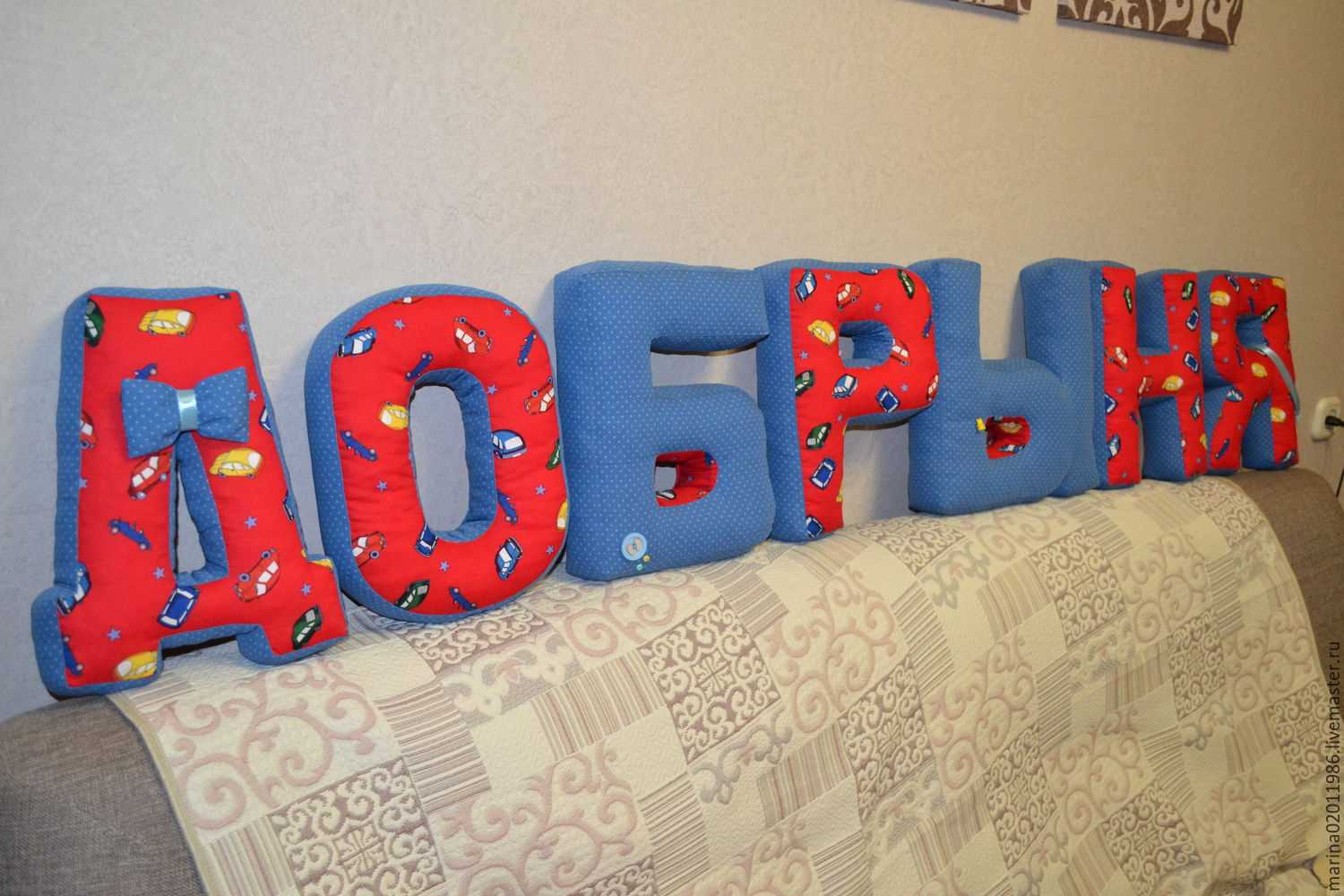 Volume and flat letters for decor can be done independently or ordered from the master, if you do not have the time, skills or desire to do it yourself.Any needlewoman for a good payment will gladly tie the letters in the form of sofa cushions. To order in any carpentry workshop, they will arrange sidewalls for children's furniture - benches, tables and chairs. It is better if these letters make up the name of the child.
