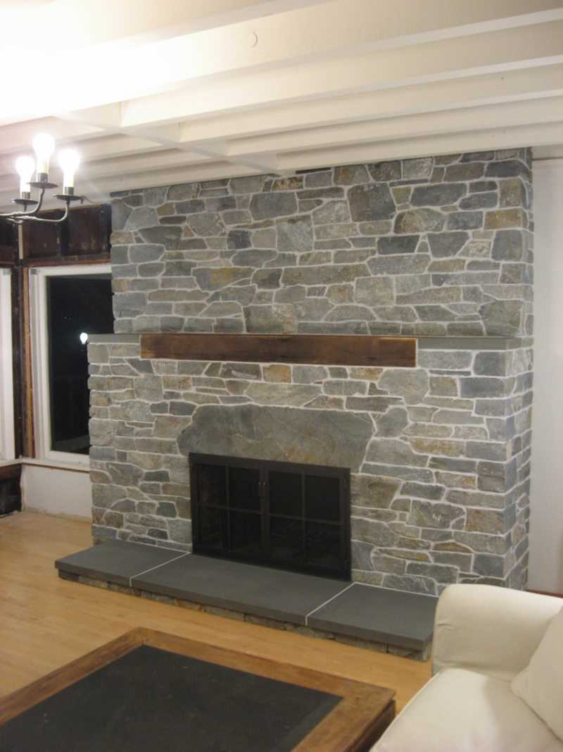 The walls and fireplace are decorated with decorative stone