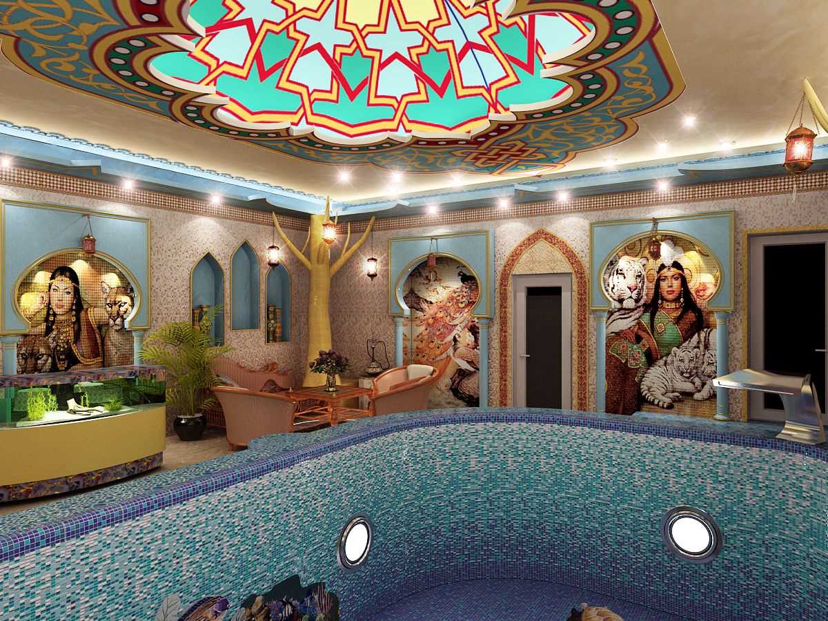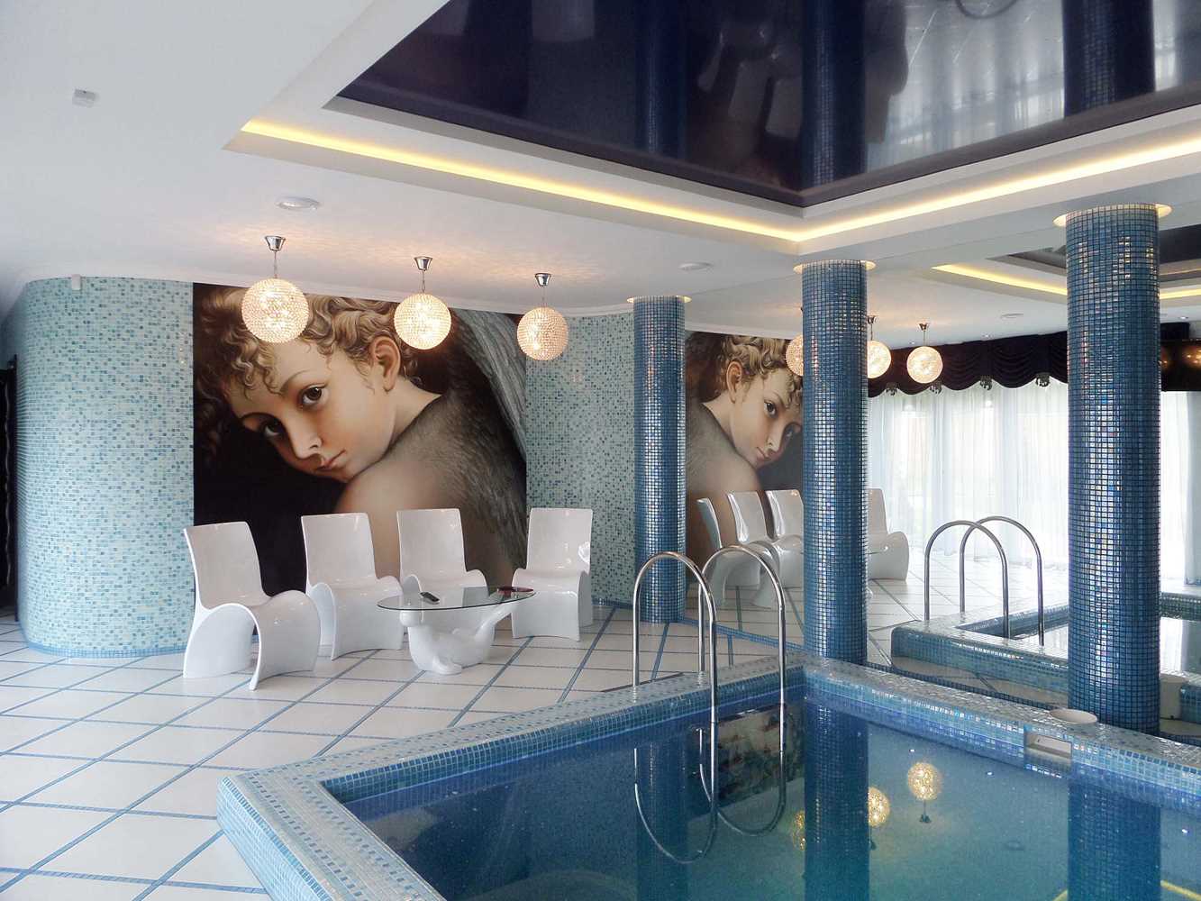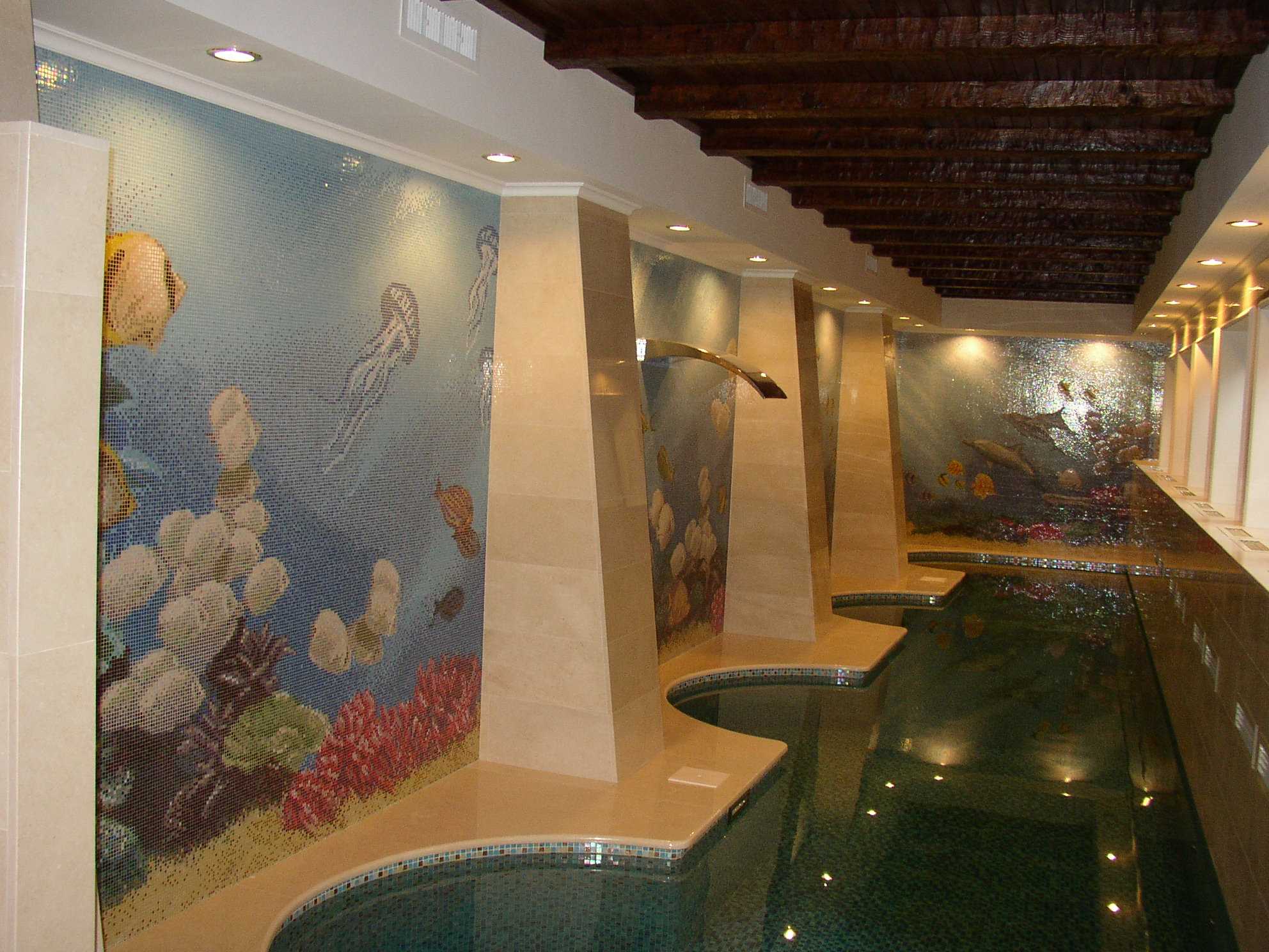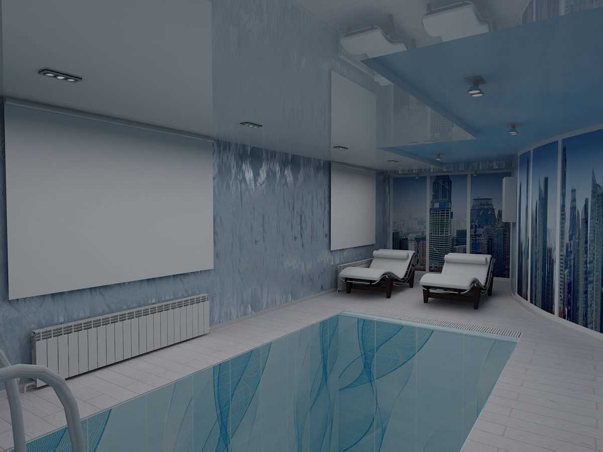The interior decoration of the pool should start with the decoration of the bowl. Decorative film in a closed pond looks cheap, so this option should be immediately discarded. Natural stone is also good only in open space. The best solution would be ceramic or mosaic. The choice of decoration materials is determined by the shape of the bowl; a mesh-based mosaic is more convenient for the design of curved lines.