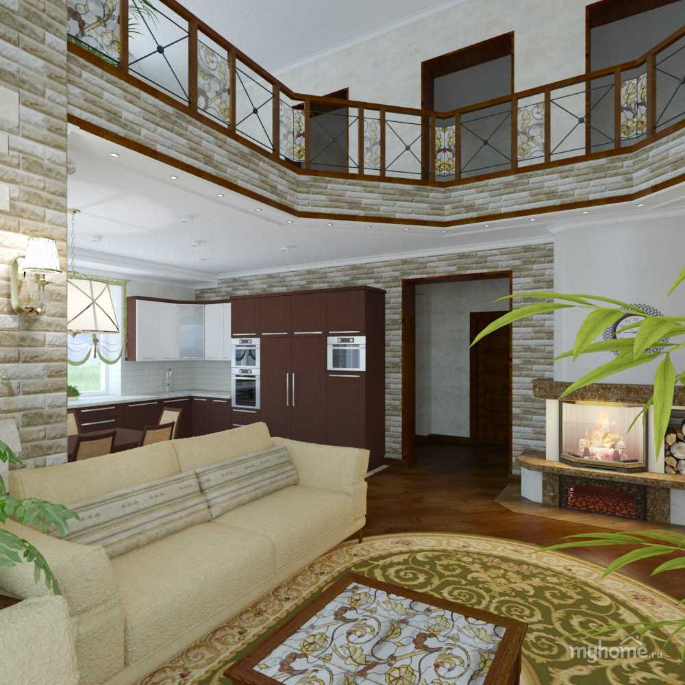 The fireplace in the interior of the living room will create a pleasant atmosphere.