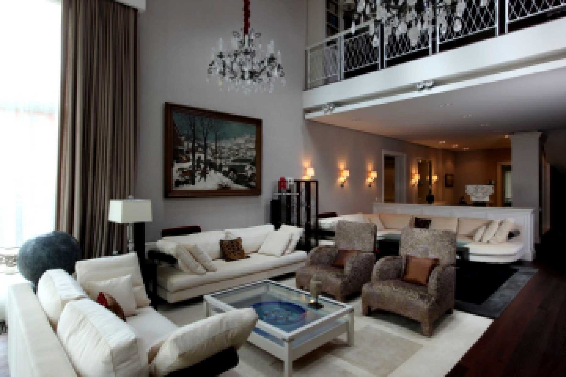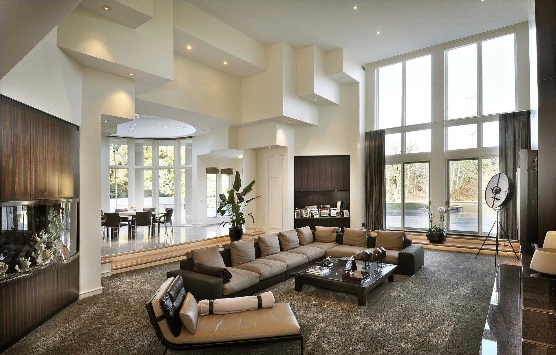 The design of the room implies both massive furniture and dimensional lighting devices that help natural light illuminate the living room at night.