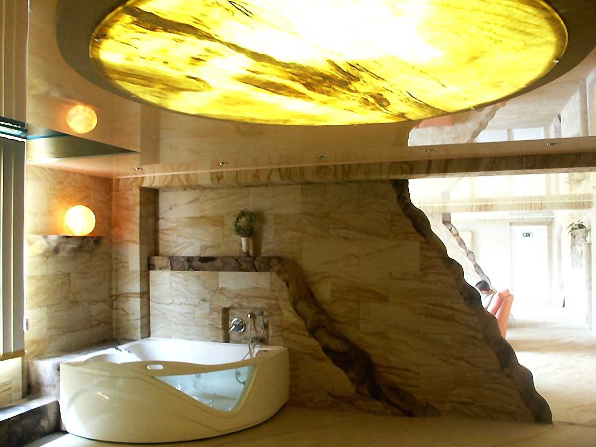 For finishing curved surfaces in the interior, a flexible stone is better than other options. It is difficult to choose a material that would fully meet the requirements and was sufficiently plastic for the outer lining of the bathtub, jacuzzi or mini-pool.