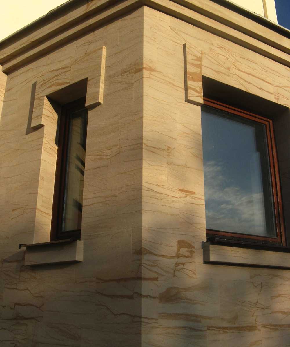 The low density of sandstone and its pleasant texture make it the most popular raw material for innovation.The natural texture is preserved, while working with such a lining is a pleasure.