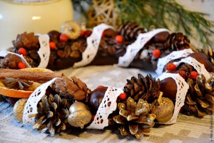- First you need to twist two circles from the branches, after that - paint them white. Both circles are wound together with a dense thread. Spruce branches, cones and mountain ash are glued on top, this gives the scenery a more festive mood.