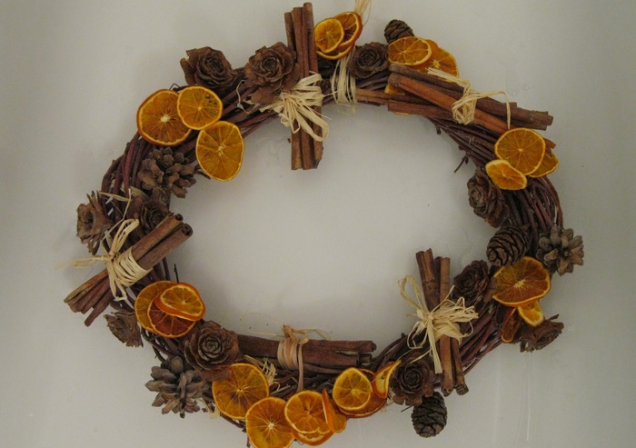 | Fruits, berries | Dried slices of oranges, lemons can be attached both to the frame itself and on top of spruce needles, paper elements, bows. |