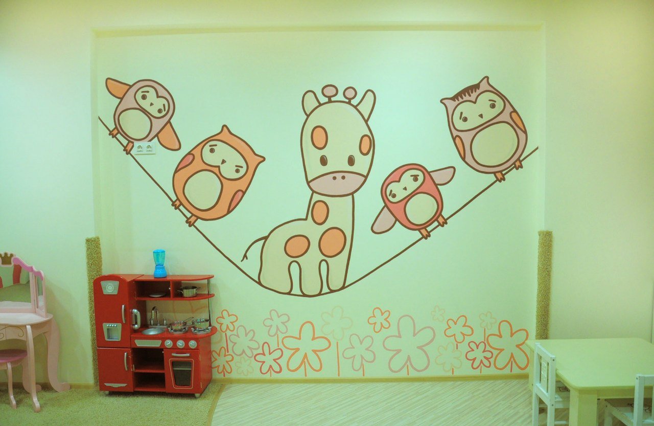 To decorate the wall with your own hands you will need paper, printer, adhesive tape, scissors, paints, brushes. Then everything is simple - select the image you like, print it, cut it out. You can glue the layout with tape so that the paint does not damage it. It is recommended to mark in advance where the drawings will be. Then just apply the patterns through the stencil using brushes, sponges.
