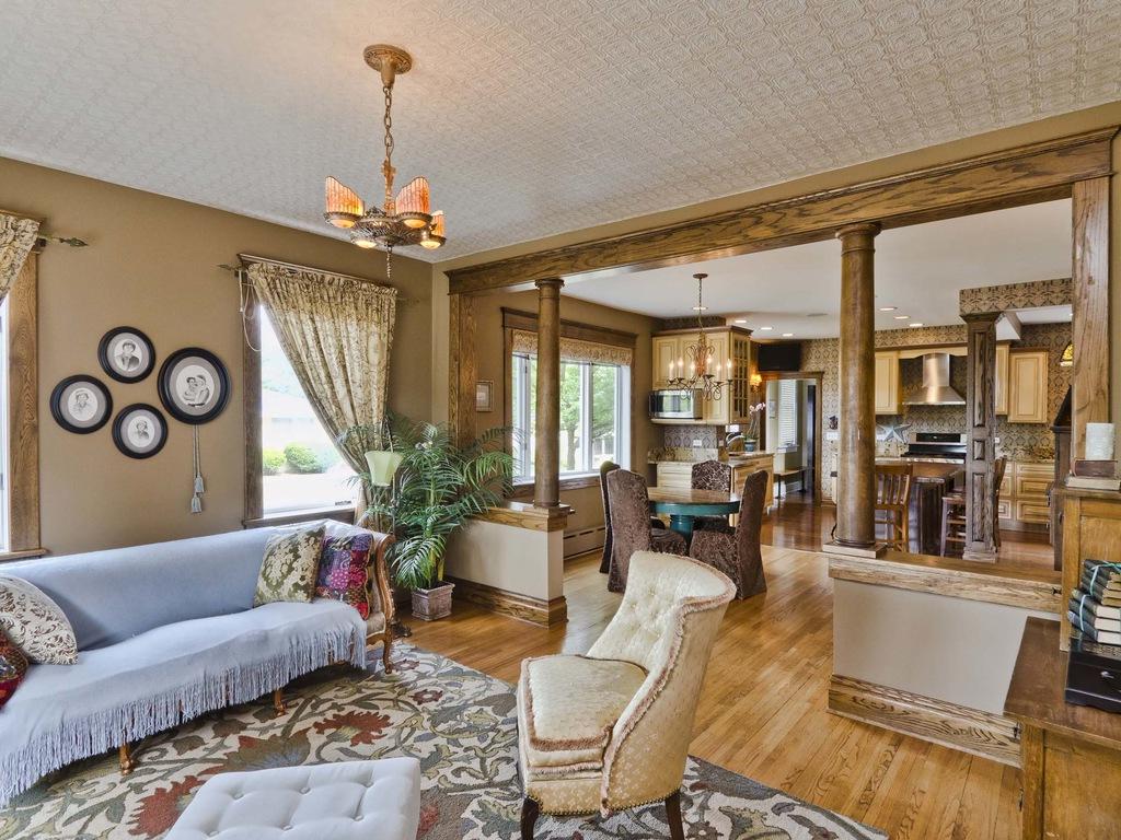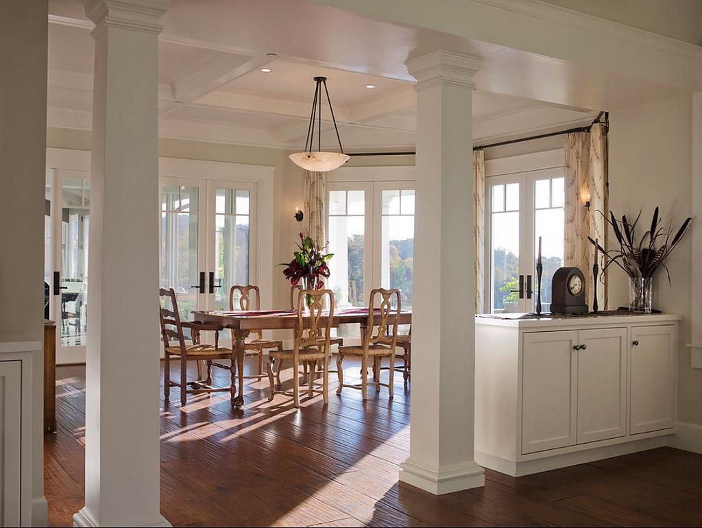 Wooden columns in the interior will find wide application in such a classic style as Old England. Polished facades of furniture, wall panels, as well as columns painted in dark brown shades are the hallmark of this style. The installation of wooden columns in a classic interior makes it possible to equip them with open or closed type bookshelves, a minibar or a shelf for open wine storage.