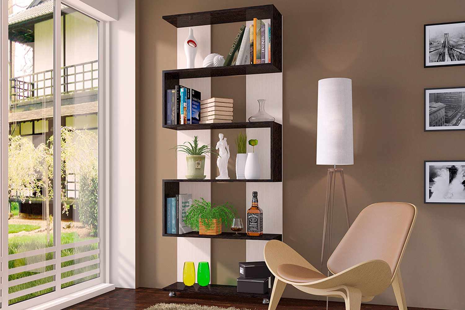 In the living room, the shelves combined with the bedroom can serve as a partition, both deaf and through, made in different forms. For example, in the form of an ordinary closet or stairs, slides.