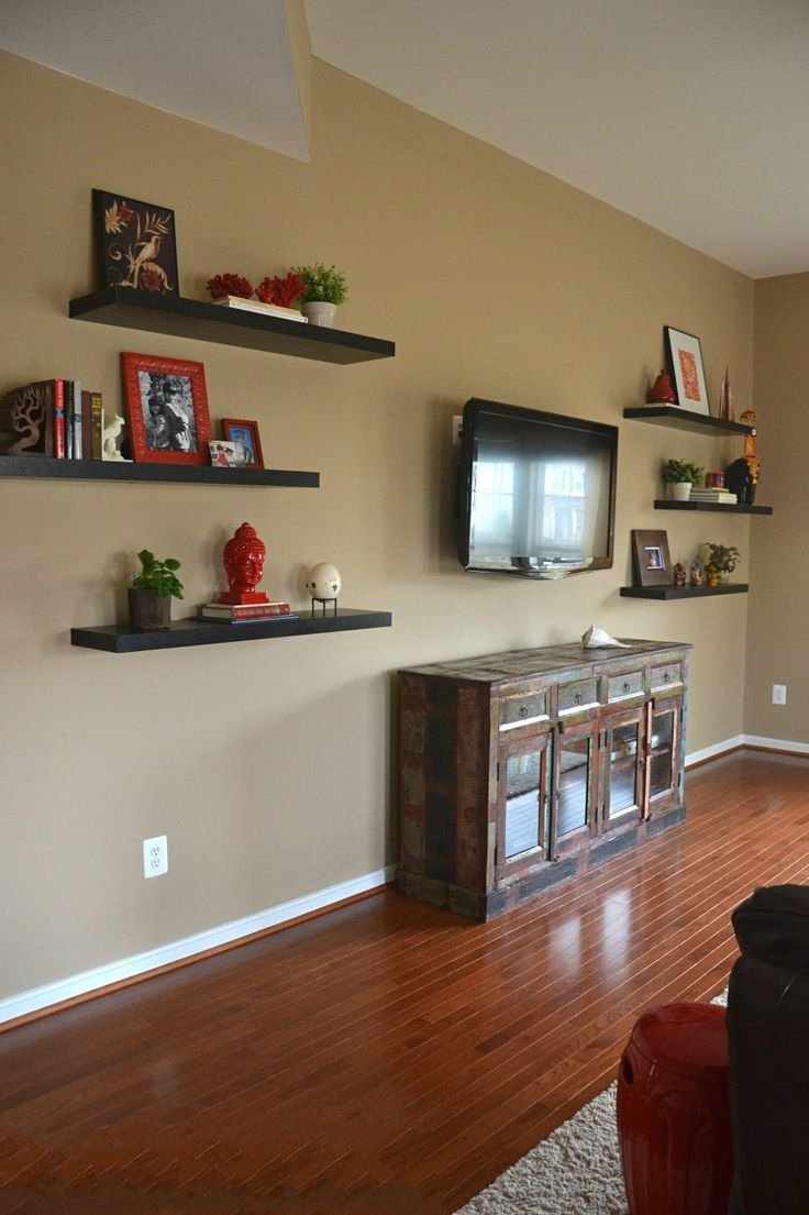 - Most often in the living room shelves are hung over a sofa (sitting area) or over a TV. Then it’s appropriate to place books above the sofa, and photo frames or souvenirs above the TV.