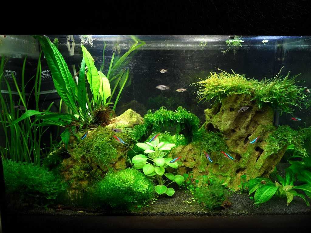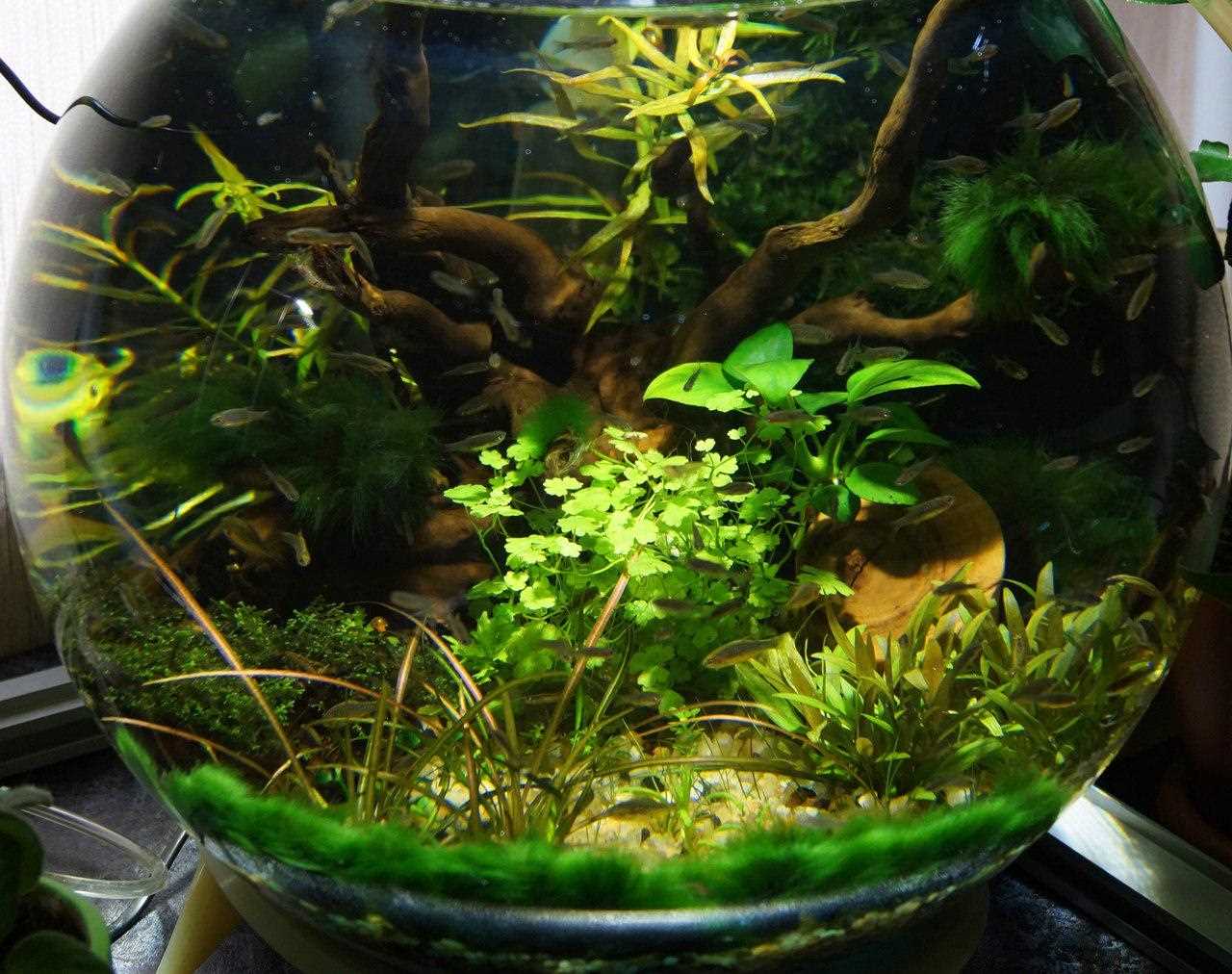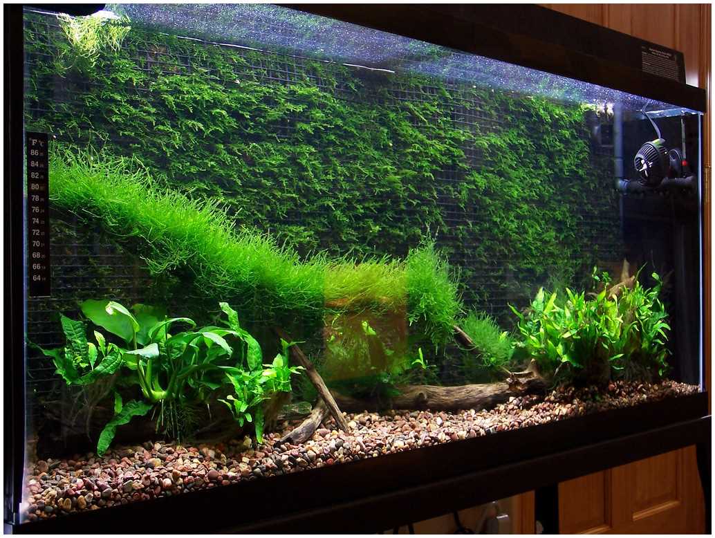 For example, decoration with Eleocharis sp. Mini will create a soft lawn that does not grow and does not require regular mowing. You can also supplement the aquarium with a couple of stones and a snag with moss in the form of a bonsai. To do this, you can use Javanese moss, which is unpretentious in breeding, and the only requirement for full growth is an established system of carbon dioxide circulation. In dim lighting, Javanese moss will have an oblong shape and a lighter shade, in bright light its texture will be denser and its shape more compact and neat.
