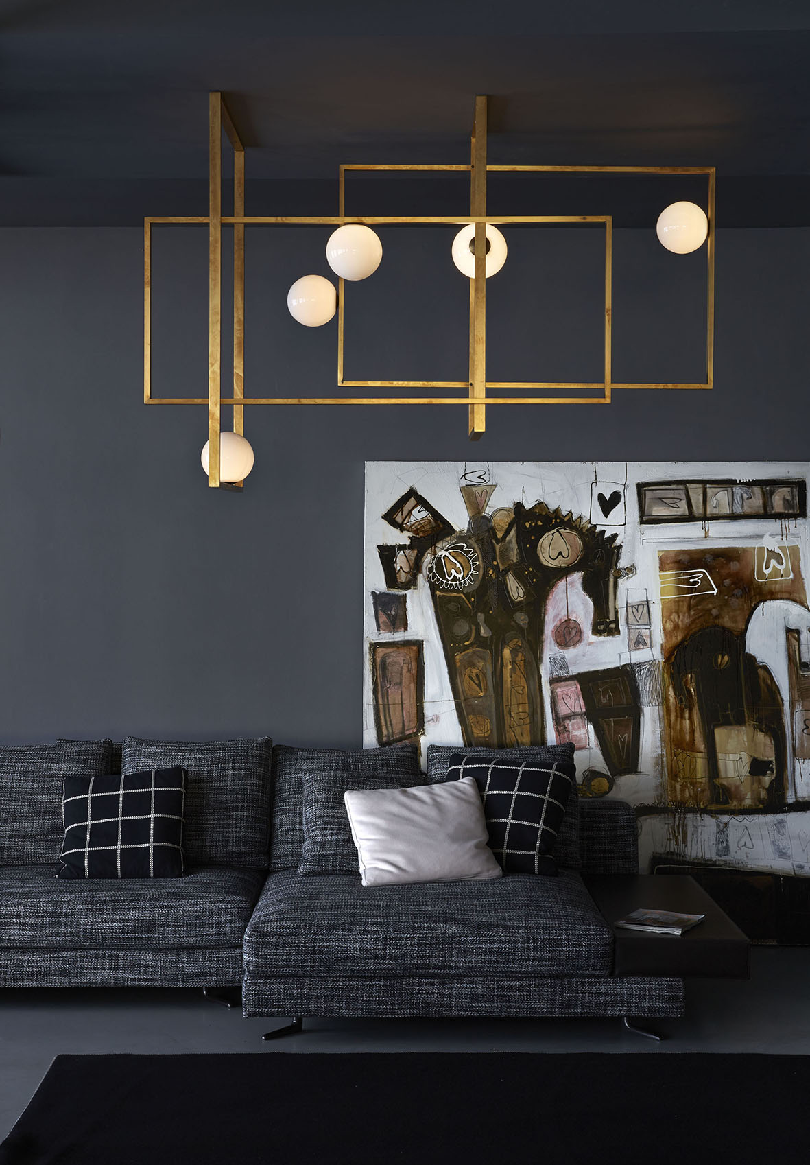 Symmetrically arranged canvases make the atmosphere more austere and restrained