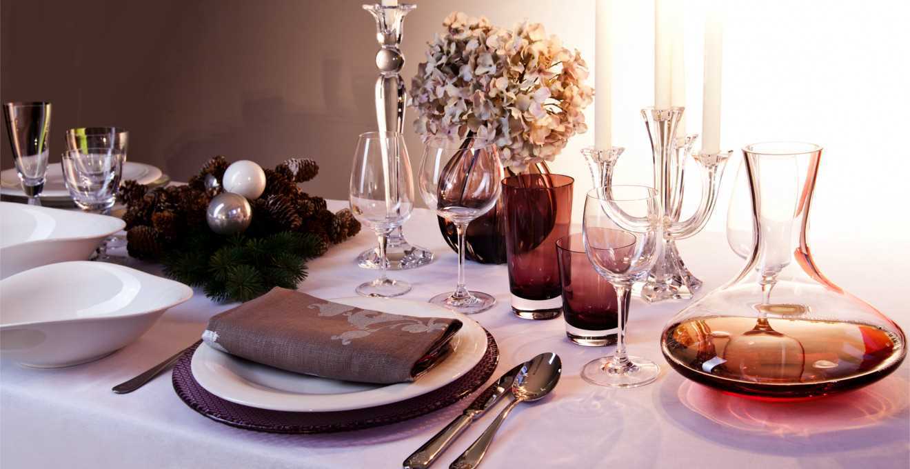 Solemn table setting is the best way to create a festive mood. Tables are decorated in different ways, the basis is a colored or lace tablecloth and chair covers. On the tablecloth, each guest can also be served linen napkins or coasters for hot food made from decorative materials.