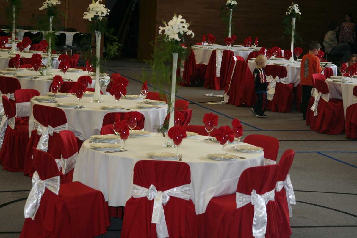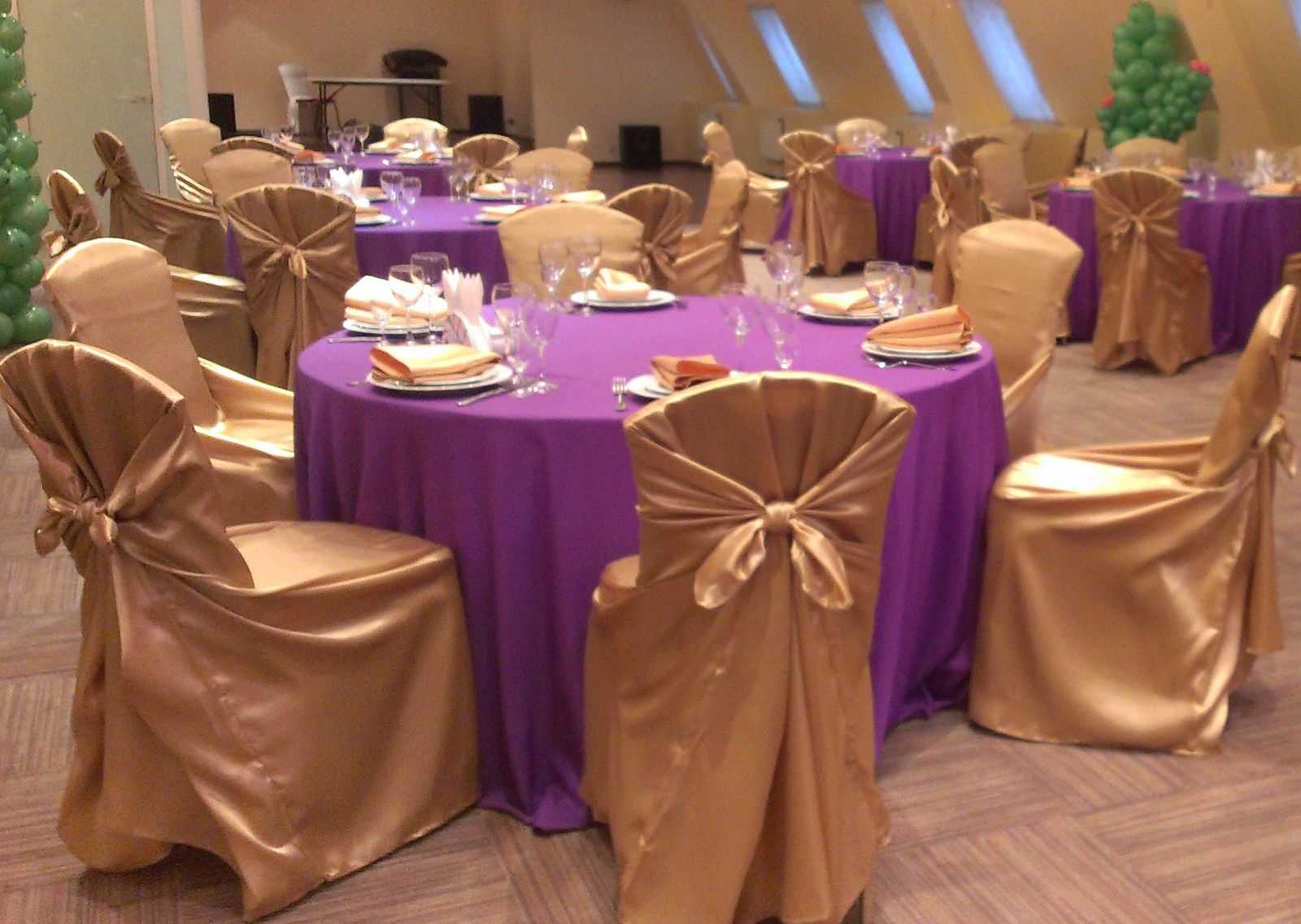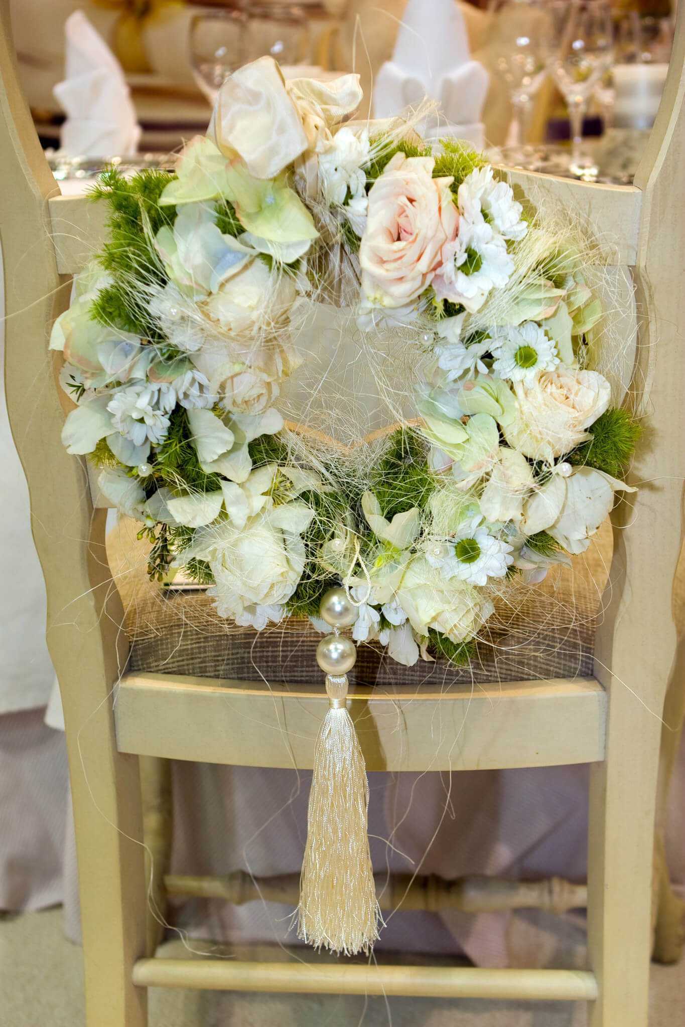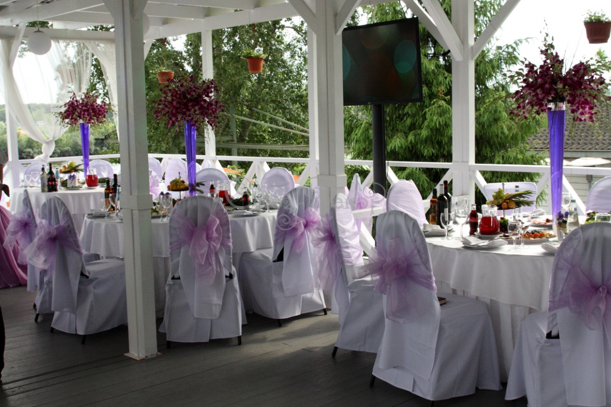The most common element for this holiday is bows and flowers. Covers with satin bows tied to them look beautiful on chairs. We will pick up decorations depending on the style of the wedding.