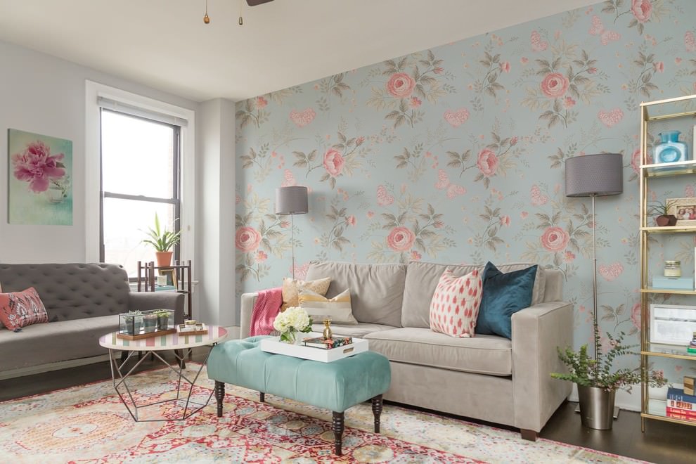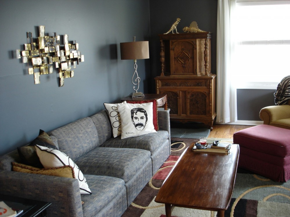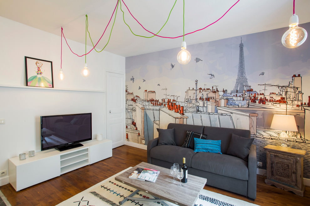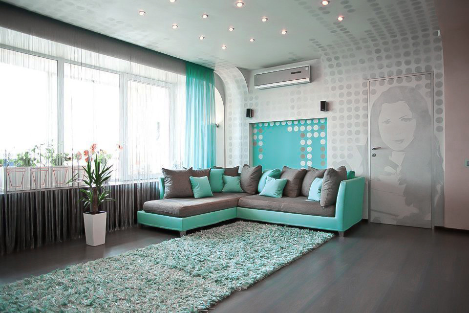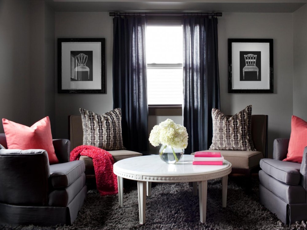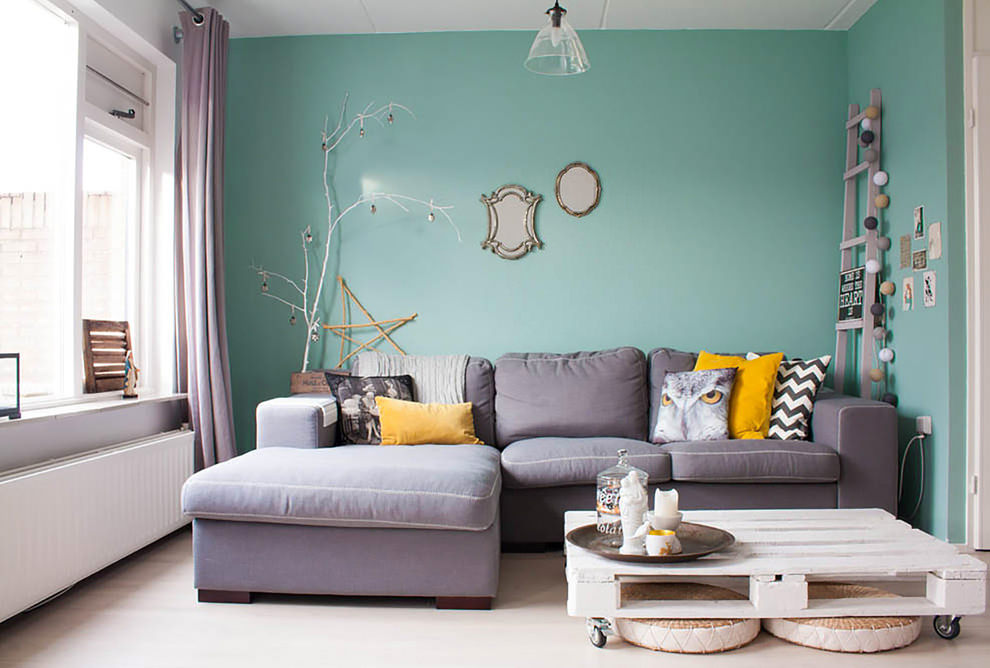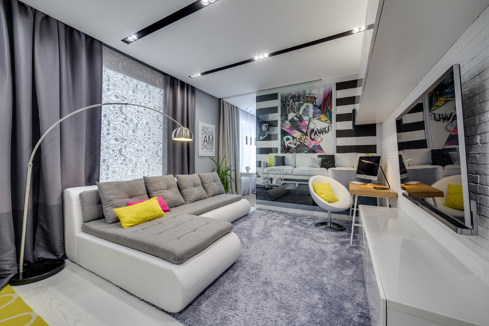 | Bright living room | AT bright saturated design colors It will look great darkgray sofa from suede upholstery or eco-leather. | 1. It is better to choose yellow or blue contrasting colors.