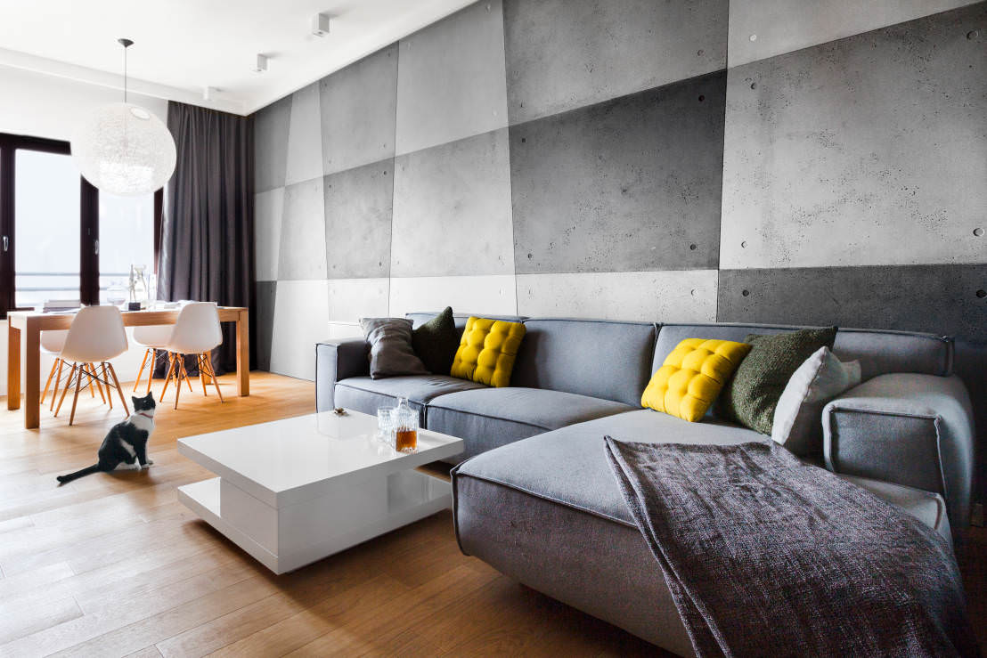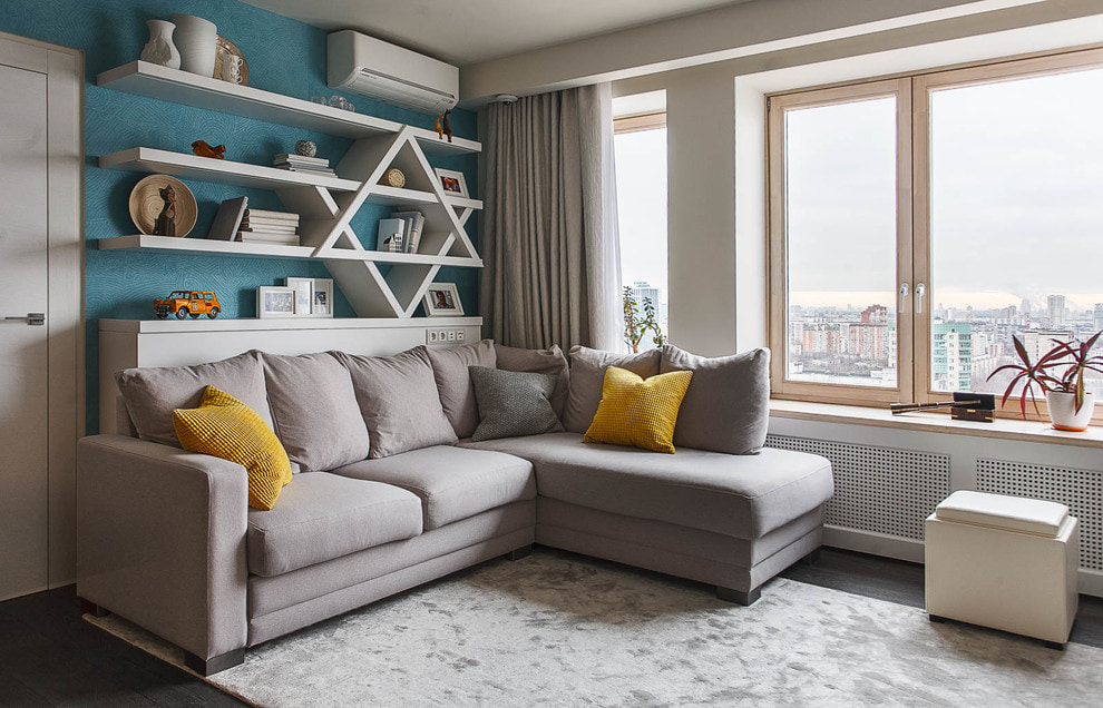 A gray sofa can be used as the main accent of the interior.