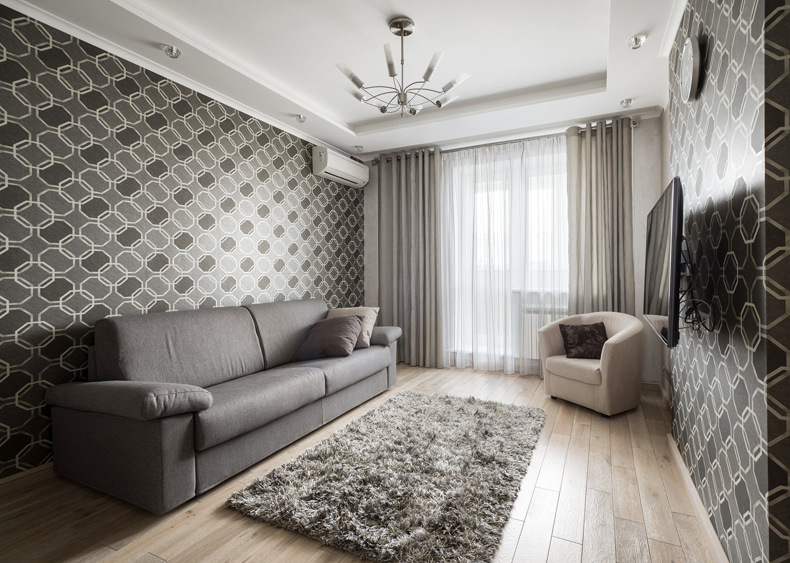 Shades of gray are perfect for people who live in a frantic urban rhythm, and prefer a quiet measured lifestyle. He will fill the living room with calm.