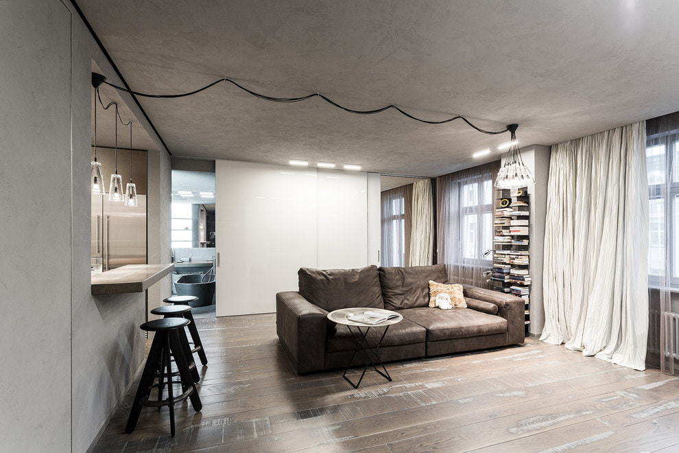 A sofa with gray upholstery will be a harmonious complement to the interior in the loft style.