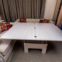 When folded, the transformer coffee table takes up minimal space; it can be comfortably pushed to the sofa or placed next to the TV chairs. In the case of the arrival of guests, such a table easily turns into a spacious dining table, which easily accommodates 8 people.