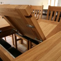 - Secondary functions. Cases of built-in drawers in transformer tables are common. They store household items or other utensils. Access to such drawers is always open regardless of the state of the table - assembled or unfolded.