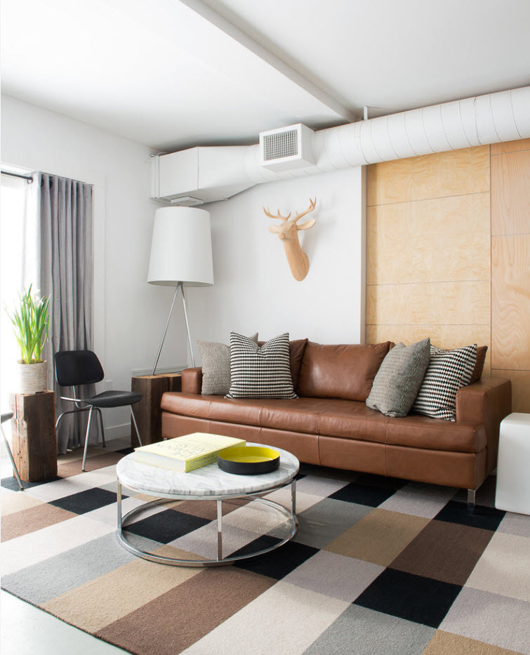 Charismatic combination of a brown sofa with almost white upholstery of a “soft” coffee table