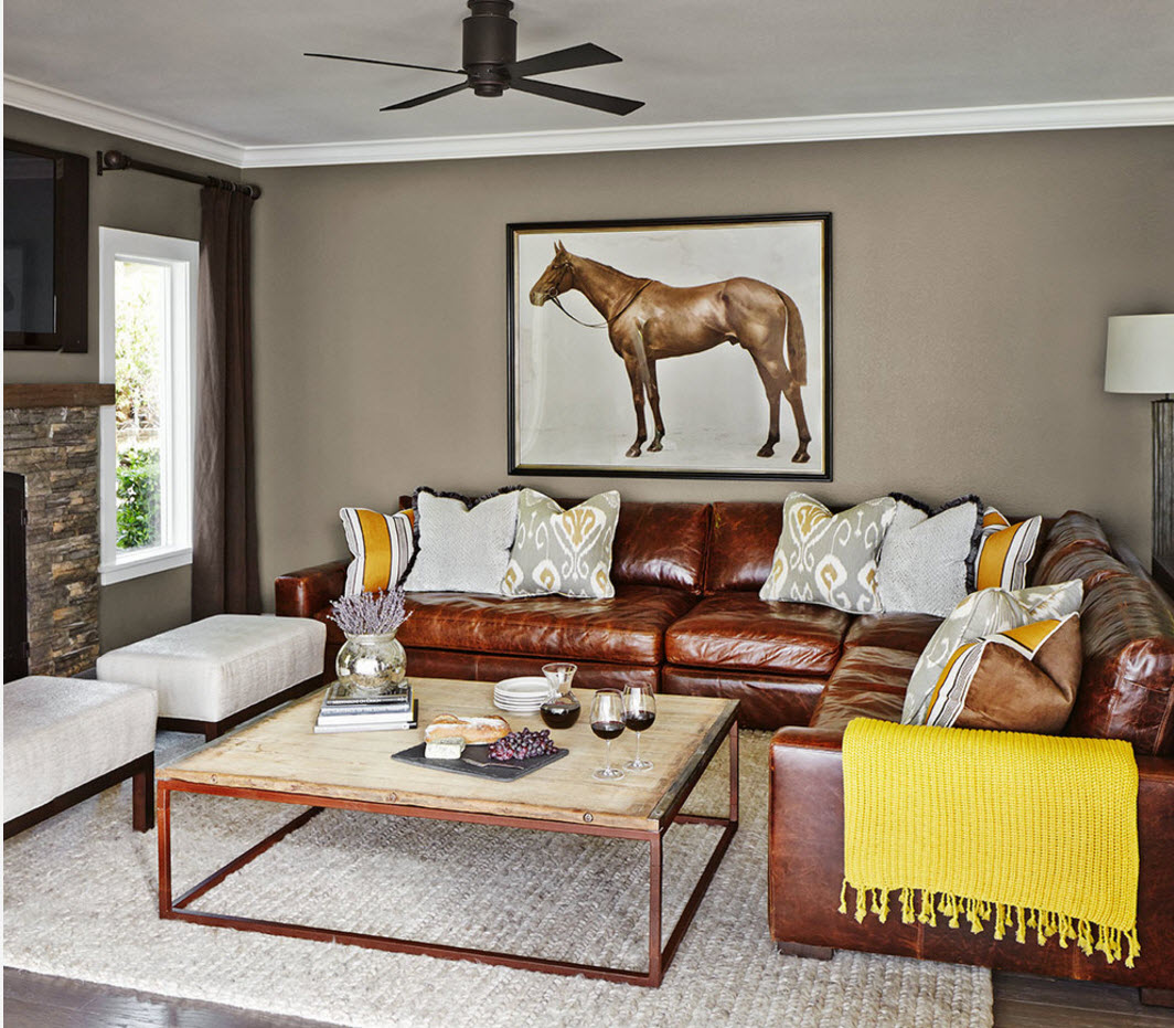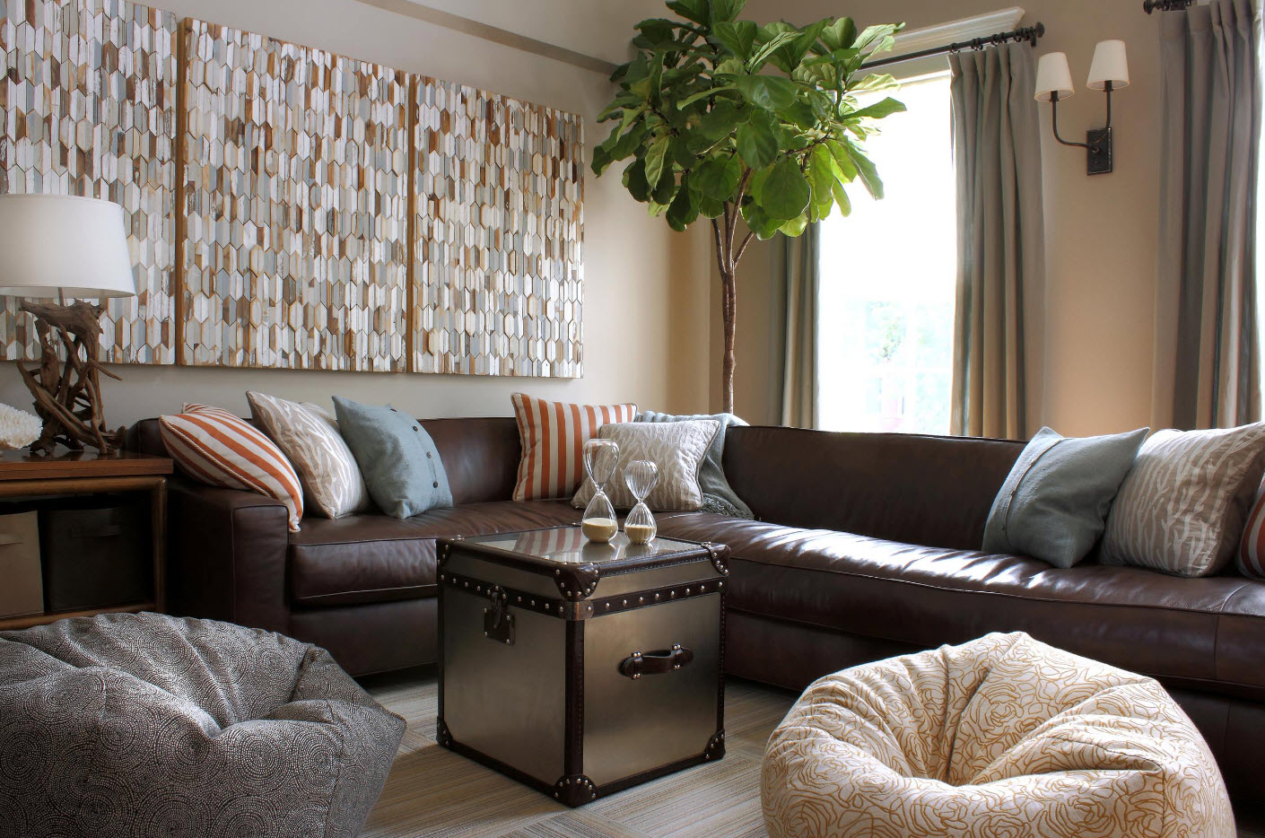 The brown sofa in the interior should stand out. Therefore, it must not be allowed to merge with the surrounding surfaces. Therefore, the walls also need to be made different in several tones or to choose a completely contrasting shade.
