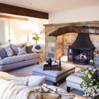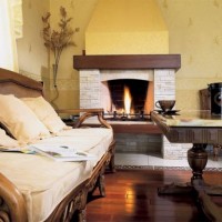 - In the living room, which has high ceilings, dark furniture and prevailing beige, yellow or green colors, a stone fireplace is suitable.