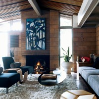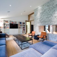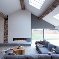 And lovers of watching television should put a fireplace and TV on the walls perpendicular to each other. Then the room will be divided into two zones. The TV cannot be placed above the fireplace, otherwise the gaze will be thrown between watching TV and watching the flame. Then the whole point of our idea will be lost.