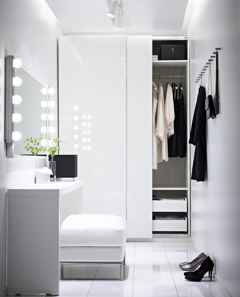 - You need to buy a sliding wardrobe. Other options are not suitable. Doors do not swing open in compartments. They move smoothly to the sides, so it does not require a lot of space.