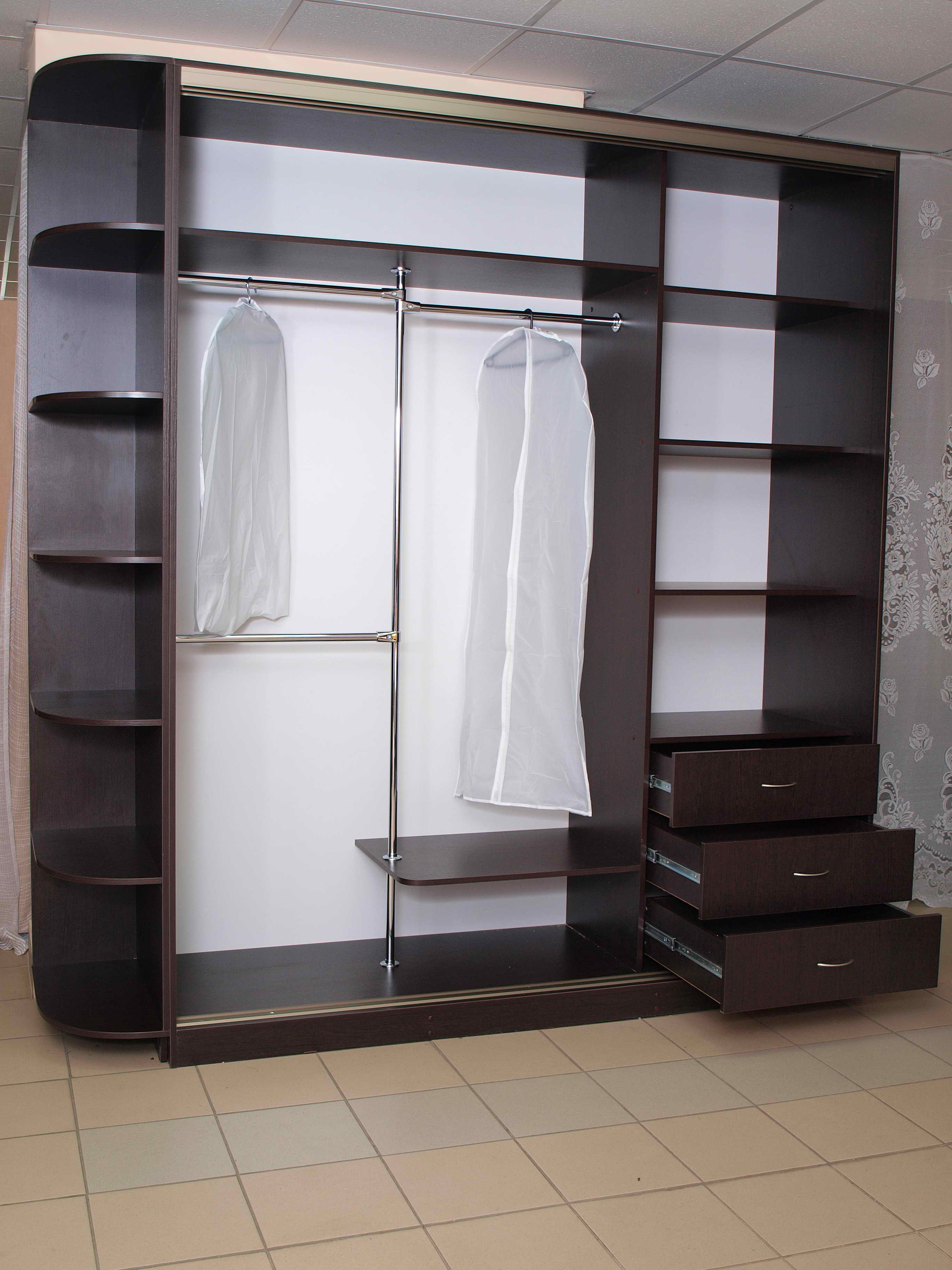 Tip. Choose the option when the wardrobe bar with trempels (shoulders on hooks) goes deep into the corner, so that it is convenient to move clothes.